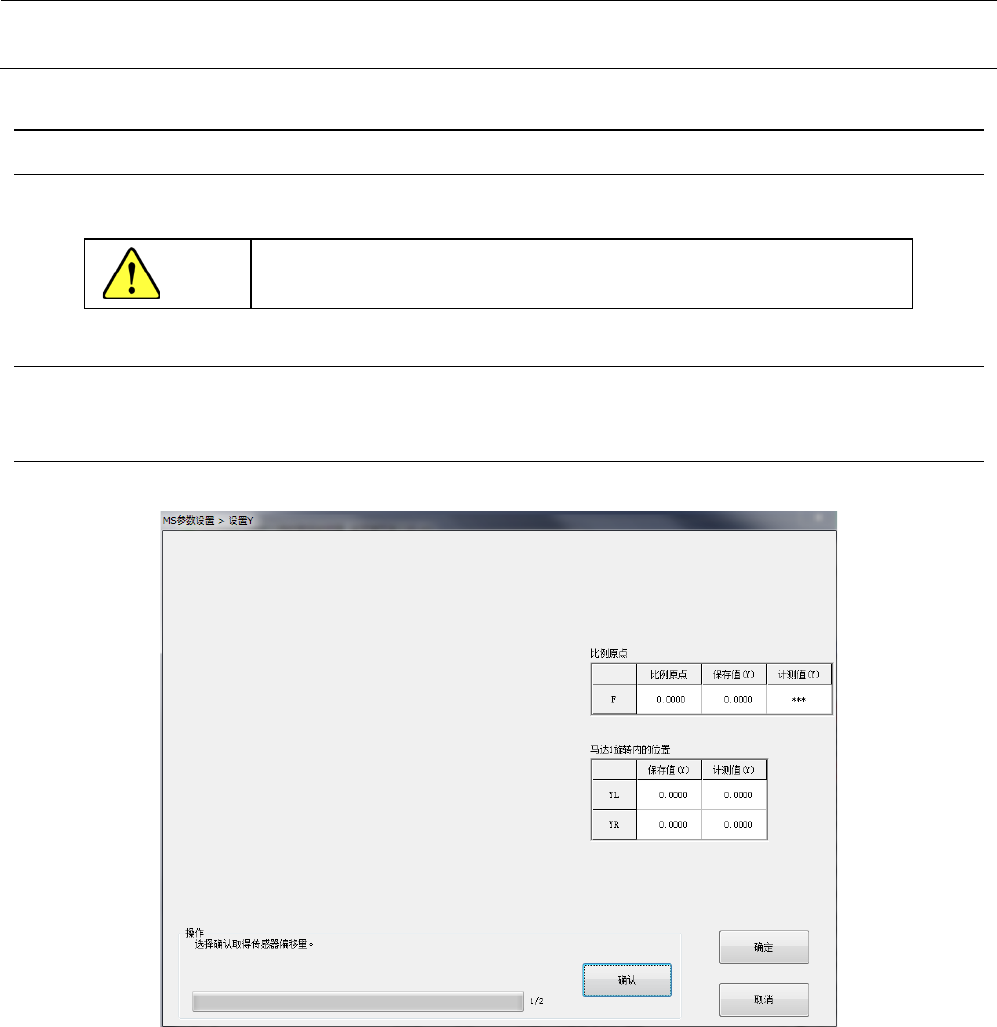 MS 参数 4-4 Y 设置 4-4- 1 功能 为了取得 Y 轴原点传感器位置的偏 差而使用。 4-4- 2 使用模具 本设定不使用模具。 4-4- 3 操作 从菜单中选择“基座 参数 ” - “ Y 设 置”后,会显示如 下的对话框。 如选择 “ 操作” 项目中的 “确认” 按钮, 将进行无 轴扭转的原点 复归, 在左侧的原点传感 器位置上结束 动作。 进行本设置时务请在尚未原点复归的状态下进行。 注意 4-8