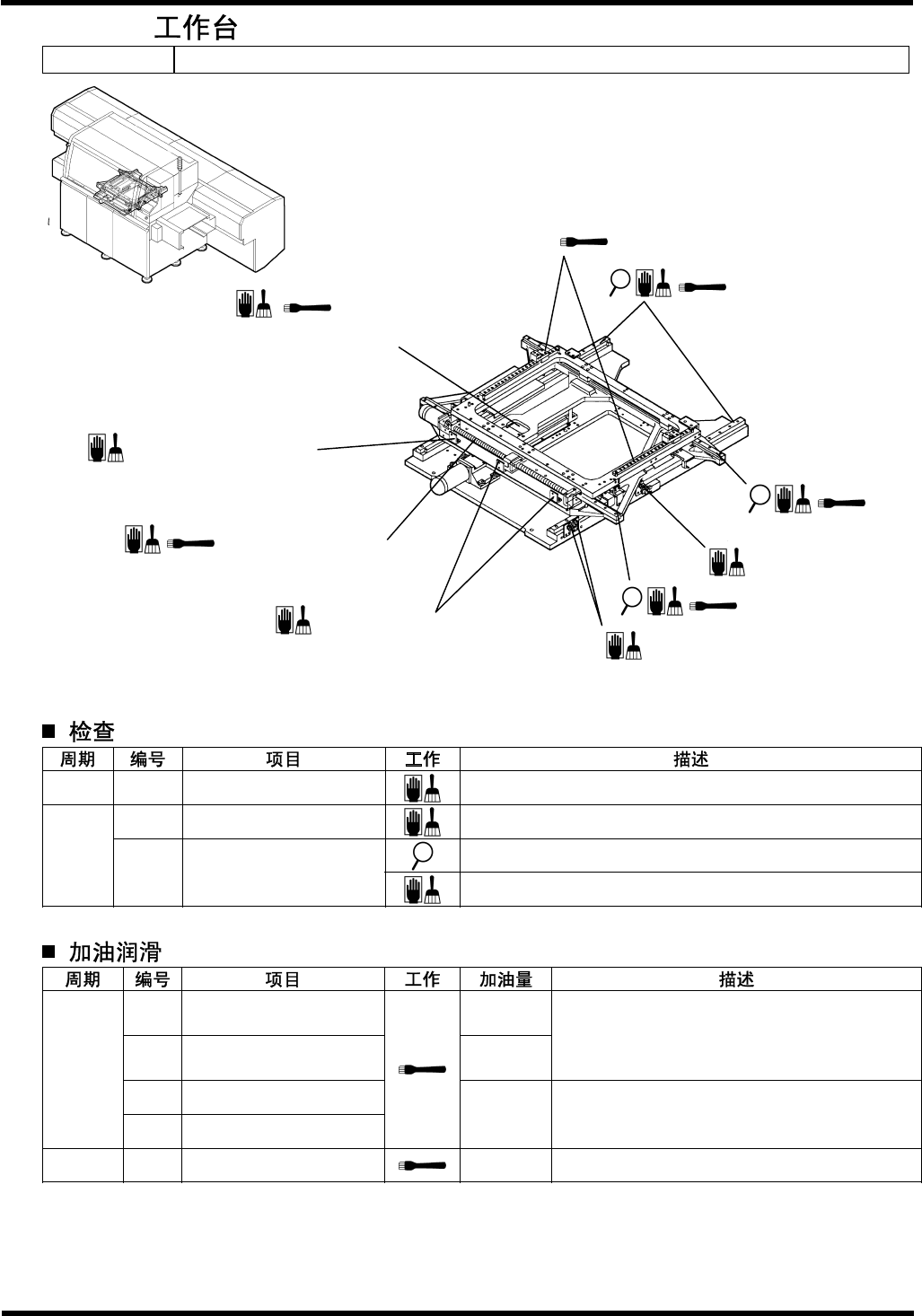 AVK3 维修 手册 6.2 检查 和润滑 D77M CC-80-02 0-A0 6.2-9 6.2.4 XY 工作 台 5. LM 导杆 适量 1. 皮辊 位置 :每个 轴孔。 2. 连接 支承 1 至 2 滴 3. 轴表 面 适量 涂一 层薄薄 的润滑脂 。 4. 轴承 滑动单元 5. 连接 支承 位置 :每个 支承。 6. 连接 支承 6.2.6 上料器 / 下料器 7. 气缸 支承 1 至 2 滴 10. 弹簧 ( 2 ) 1…
