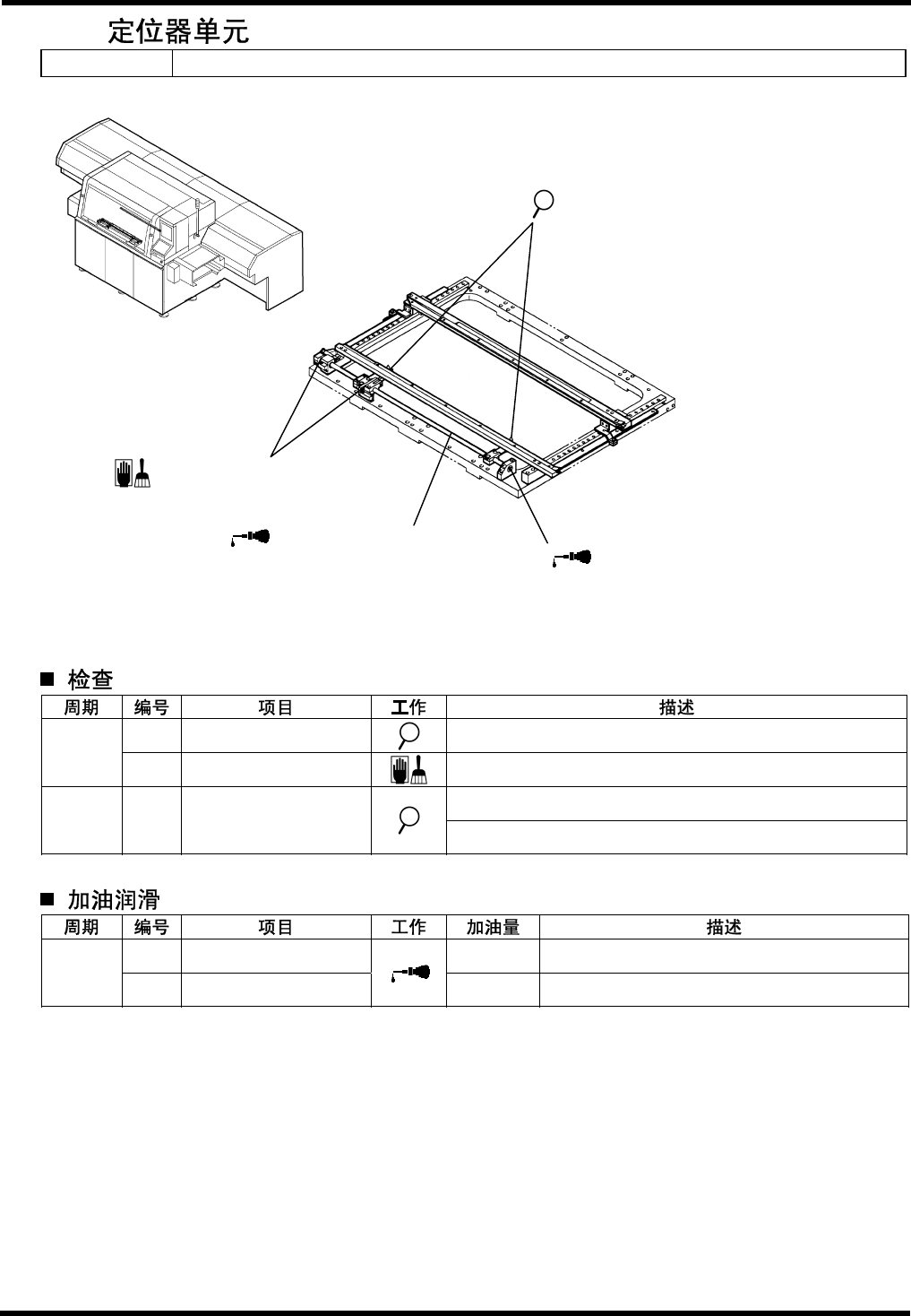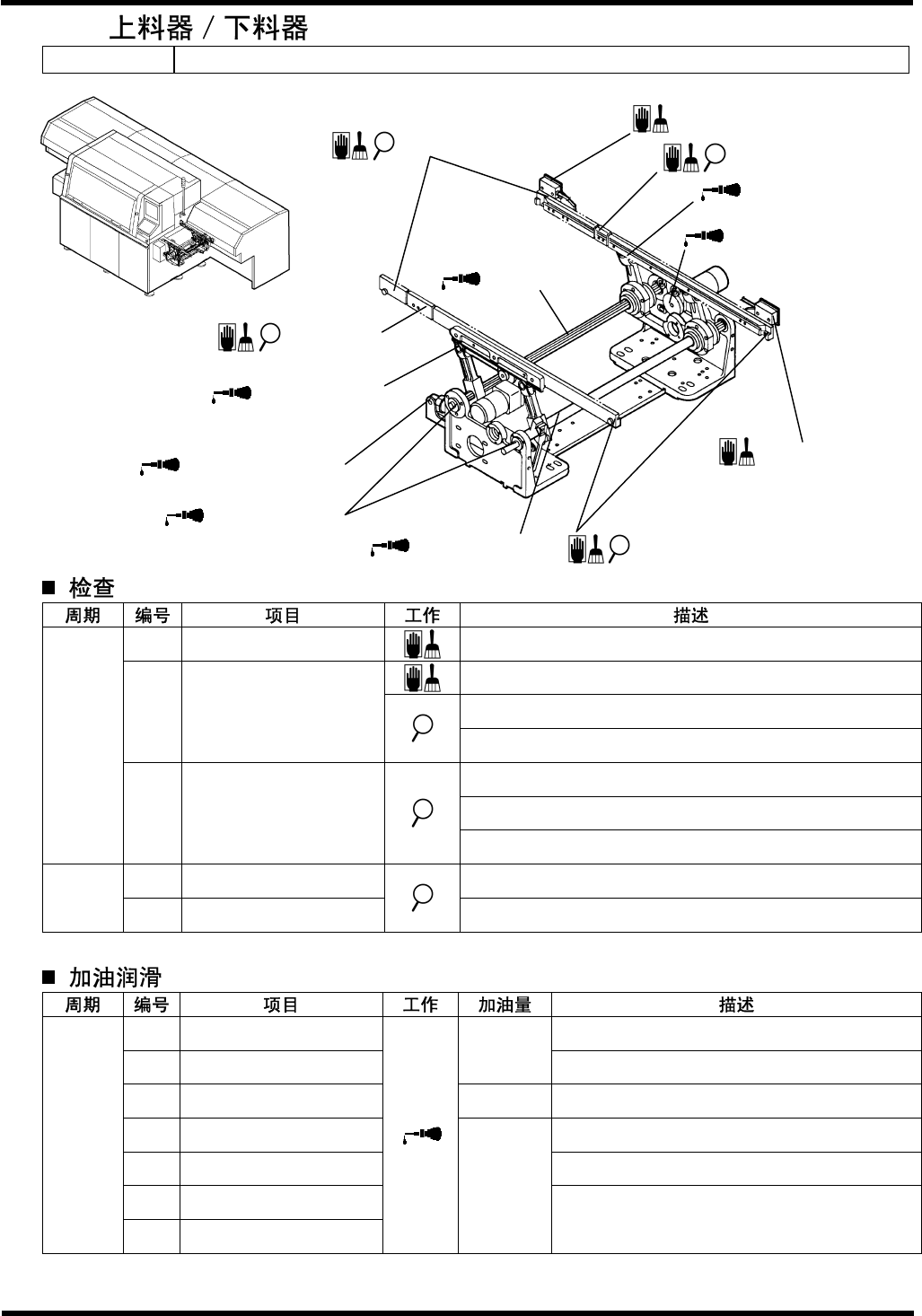 AVK3 维修 手册 6.2 检查 和润滑 D77M CC-80-02 0-A0 6.2-12 6.2.6 装置 编号: 1087105 300 a. 光电 传感器 清除 油或灰 尘。 清除 油或灰 尘。 确保 皮带没 有磨损或 损坏。 b. 皮带 确保 皮带张 力正确调 节。 确保 导轨的 宽度比印 刷线路板 的宽 0.5-1mm 。 确保 轨道上 下移动正 常。 每天 c. 轨道 确保 印刷线 路板传送 平滑。 d. 皮带 确保 …