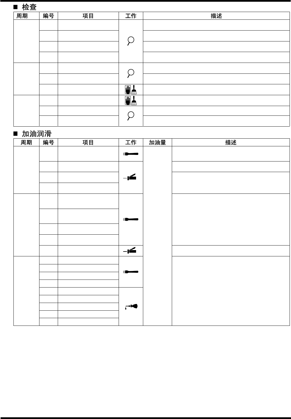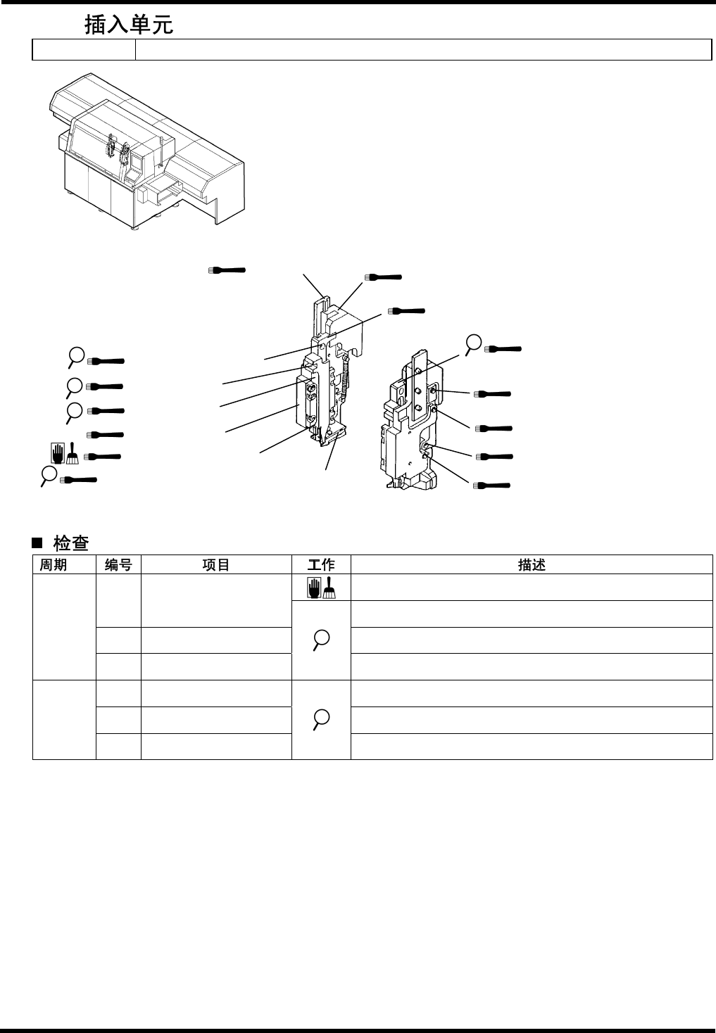 AVK3 维修 手册 6.2 检查 和润滑 D77M CC-80-02 0-A0 6.2-14 a. 各轴 确保 轴上 / 下移 动平稳 。 b. 插入 轴 确保 插入轴旋 转平稳 。 c. 导螺 杆 确保 导螺杆工 作平稳 。 每天 d. 滑块 确保 滑块移动 平稳。 e. 螺母 确保 螺栓不会 松动。 f. 凸轮 从动件 确保 凸轮从动 件移动 平稳。 每周 g. 线性 轴衬 清除 异物或灰 尘。 h. 同步 支带轮 凹槽 :清除…