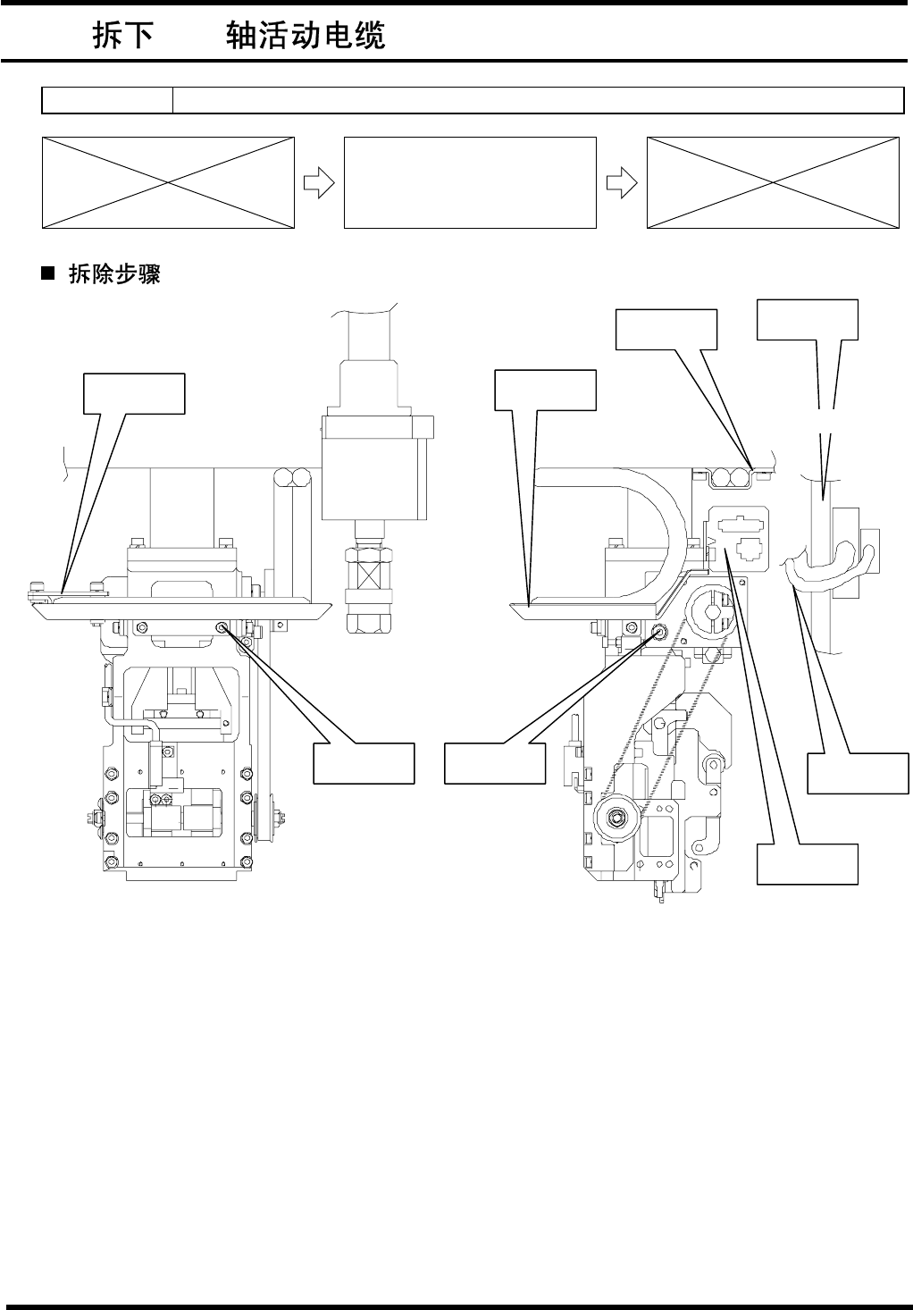 AVK3 维修手 册 7.3 拆下 WH 轴活 动电缆 D77M CC-83-ED 0-A0 7.3-2 1 使用内六角扳手 M3 松开固定插入头单元的板 1 的螺栓( 4 件)。 2 使用内六角扳手 M4 松开螺栓( 2 件)并将板 2 从板 1 上移开。 板 1 倒角 螺栓( 两侧) 倒角…