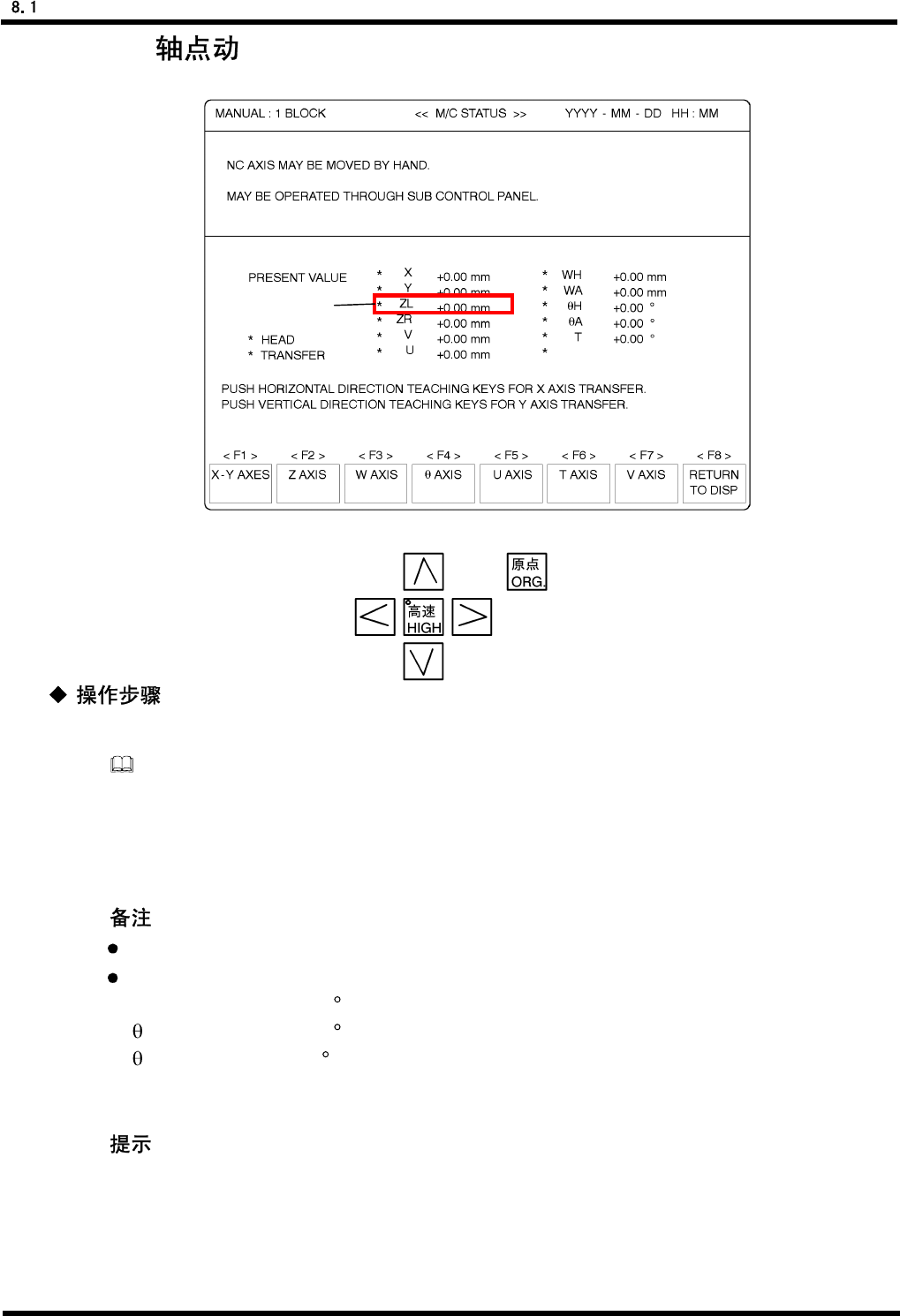 AVK3 维修 手册 移动 检查 D77M CC-71-01 0-A0 8.1-4 8.1.3 NC 通过输入移动座标使 NC 轴移动称为 NC 轴移动检查。 2. 1. 检查机器是否处于手动模式。 = = 如果没有处于手动模式,则请参阅“ 8.1.1 切换到手动模式和返回原点”一节。 2. 按“ F2 ” (AXIS MOV E CHECK )( 轴移动检查 ) 键,显示“ NC AXIS JOG CHECK ”点动检 查屏幕。 3…