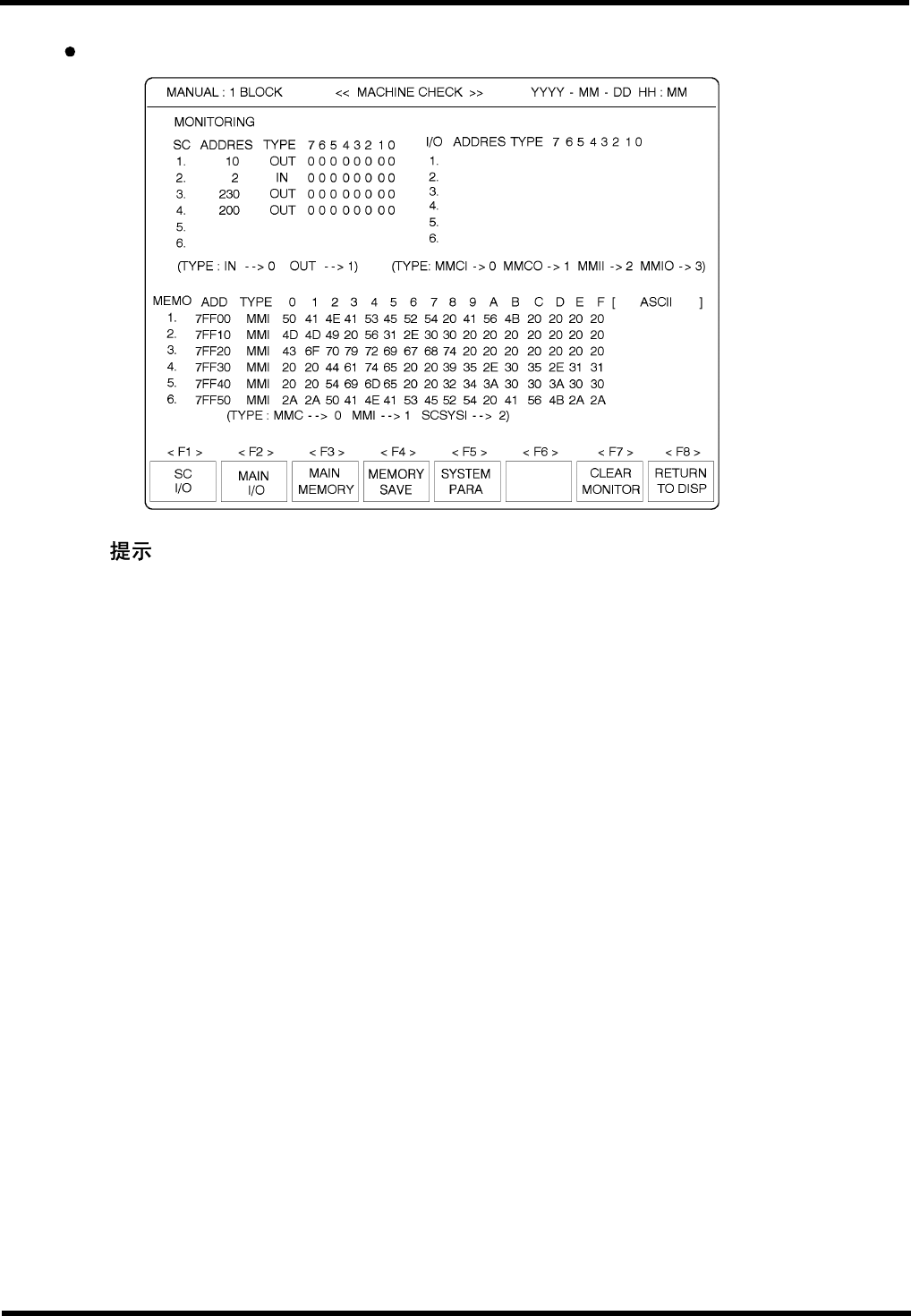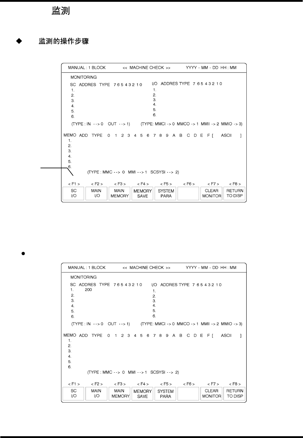 AVK3 维修 手册 8.2 监测 D77M CC-71-02 0-A0 8.2-3 8.2.2 SC 可以用 SC 输入/输出监测功能来监测指定地址的 SC 输入/输出信号。 SC 2. 1. 调用监测屏幕。 2. 选择 SC 输入/输出监测。 (1) 按“ F1 ” (SC I / O [SC 输入/输出 ]) 键。 (2) 光标将移到 SC 地址输入区。 3. 输入 SC 输入/输出的地址。 按“ 2 ”、“ 0 ”和“ 0 ”…