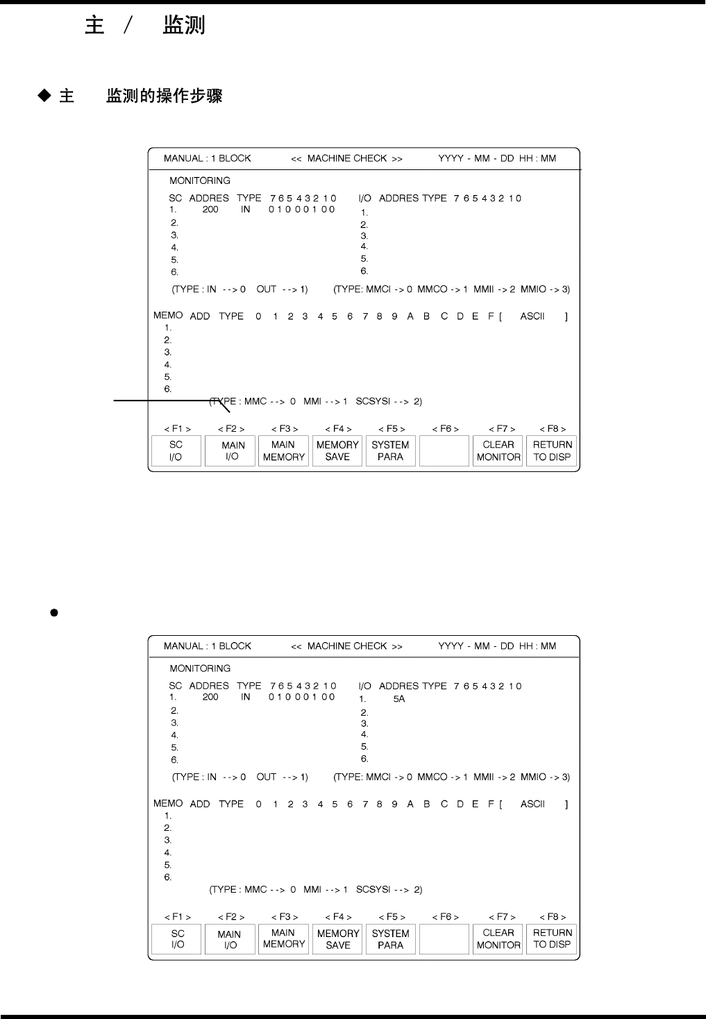 AVK3 维修 手册 8.2 监测 D77M CC-71-02 0-A0 8.2-4 4. 转到下一个输入区。 按“→”键使光标移到下一个输入区。 5. 指定监测类型。 例:若要指定输入监测。 按“ 0 ”。 6. 回车。 按“ ENTER ” ( 回车 ) 键。