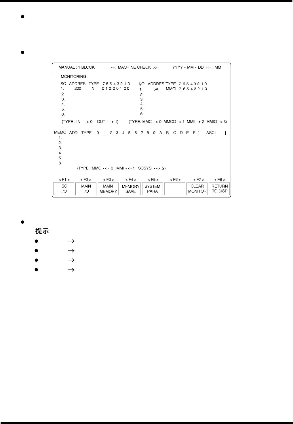 AVK3 维修 手册 8.2 监测 D77M CC-71-02 0-A0 8.2-7 8.2.4 可以用主存储器监测功能、根据地址来监测指定地址的 MMI 、 MMC 或 SC 系统的存储 器。 1. 调用监视屏幕。 2. 选择主存储器监测。 (1) 按“ F3 ” (MAIN ME MORY [ 主存储器 ]) 键。 (2) 光标将移到存储器的地址输入区。 3. 输入存储器地址。 例:若要监测存储器地址“ 7FE 00H” 。 按“…