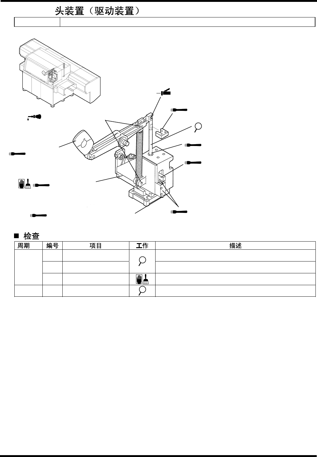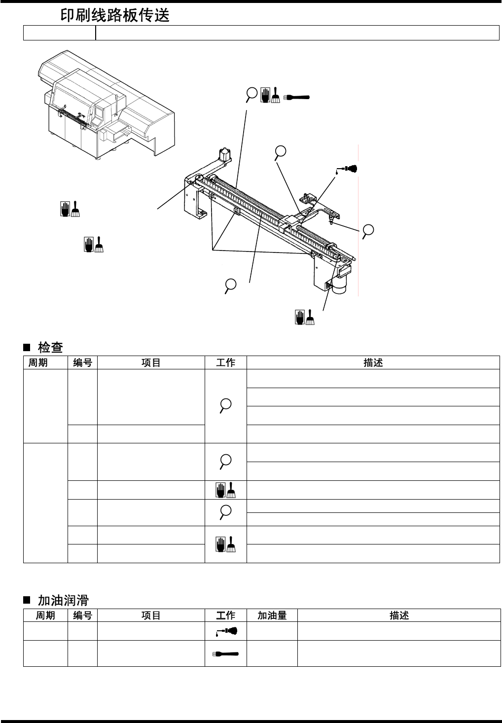 AVK3 维修 手册 6.2 检查 和润滑 D77M CC-80-02 0-A0 6.2-28 6.2.17 装置 编号: 1087106 000 确保 滑杆上下 移动平 稳。 确保 滑杆滑动 平稳。 a. 滑杆 确保 滑杆在支 承上移 动轻巧。 每天 b. 传送 销 确保 传送销正 确地位 于印刷线 路板孔 中。 确保 皮带张力 调节正 确。 c. 皮带 确保 皮带没有 磨损。 d. 轴 滑动 表面:清 除异物 或灰尘。 确保 传送…
