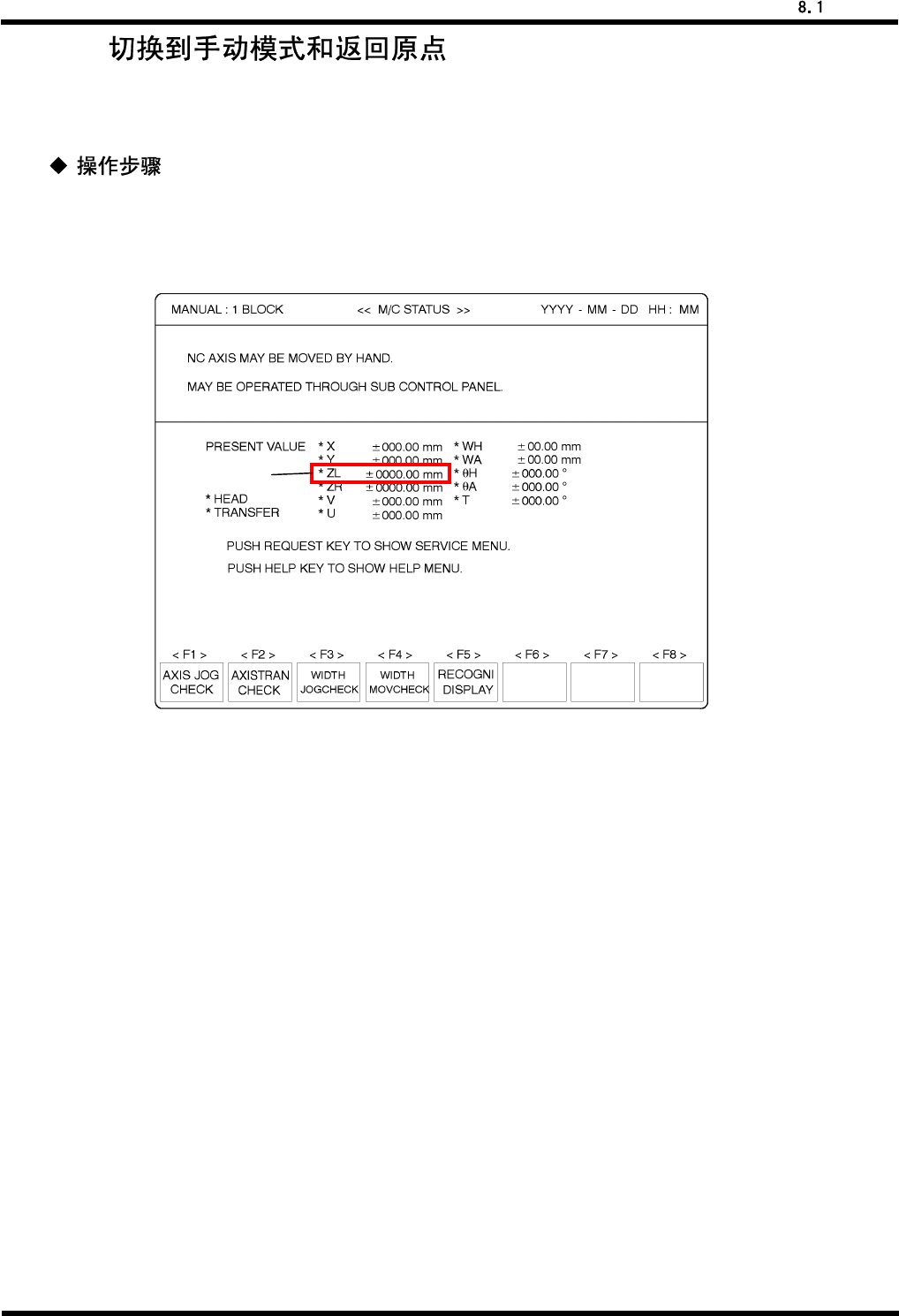 AVK3 维修 手册 移动 检查 D77M CC-71-01 0-A0 8.1-3 (120 站设 备 ) 8.1.2 NC 利用主操纵盘上的示教开关操作 NC 轴称为 NC 轴点动检查。 按主操纵盘上的示教开关时,轴会朝指定的方向移动,直至松开示教开关时为止。 1. 检查机器是否处于手动模式。 = = 如果没有处于手动模式,则应参阅“ 8.1.1 切换到手动模式和返回原点”一节。 2. 按“ F1 ” (AXIS JOG CH EC…
