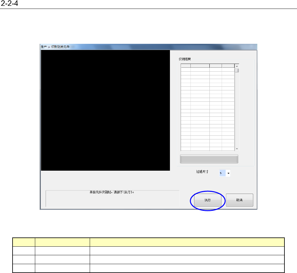 FCS 使用说明书 2- 12 XY 偏移量取得用元件 识别 完成 XY 偏移量取得用 元件的贴片 后,将 自动 显示如 下图 所示的 [ 识别贴 片元件 ] 画面。 按下 [ 再识别 贴片元件 ] 按钮,也会显示相 同的 画面。 图 2- 11 识别贴片元件 画面 表 2-6 识别贴片元件 画面项目 N o. 项目 处理 1 执行 开始 元件识别动 作。 2 取消 中止 元件识别动 作 ,返 回 [FC S 设定 ] 画面。 3 过滤…