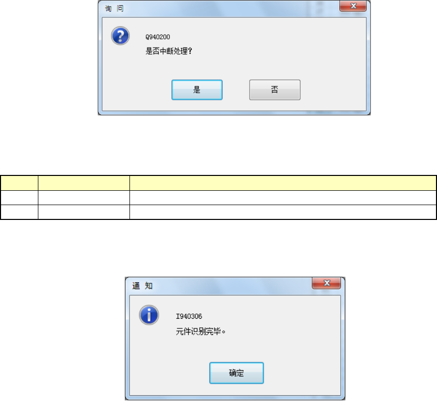 FCS 使用说明书 2- 14 因 <STOP> 开关而 中断 时,显示 下述对话框。 中断 时,在中断前 废弃识别 的 结果 。 图 2- 13 中断问询 表 2-8 中断问询对话 框的项目 No. 按钮选择 处理 1 是 废弃 识别结果,返 回 [ 识别贴片元件 ] 画面。 2 否 不中断 ,继续进行识别 动 作。 完成全部贴片点 的 识别 后,显示完成通知 对话框。 图 2- 14 完成识别对话 框 完成 识别 后 ,…
