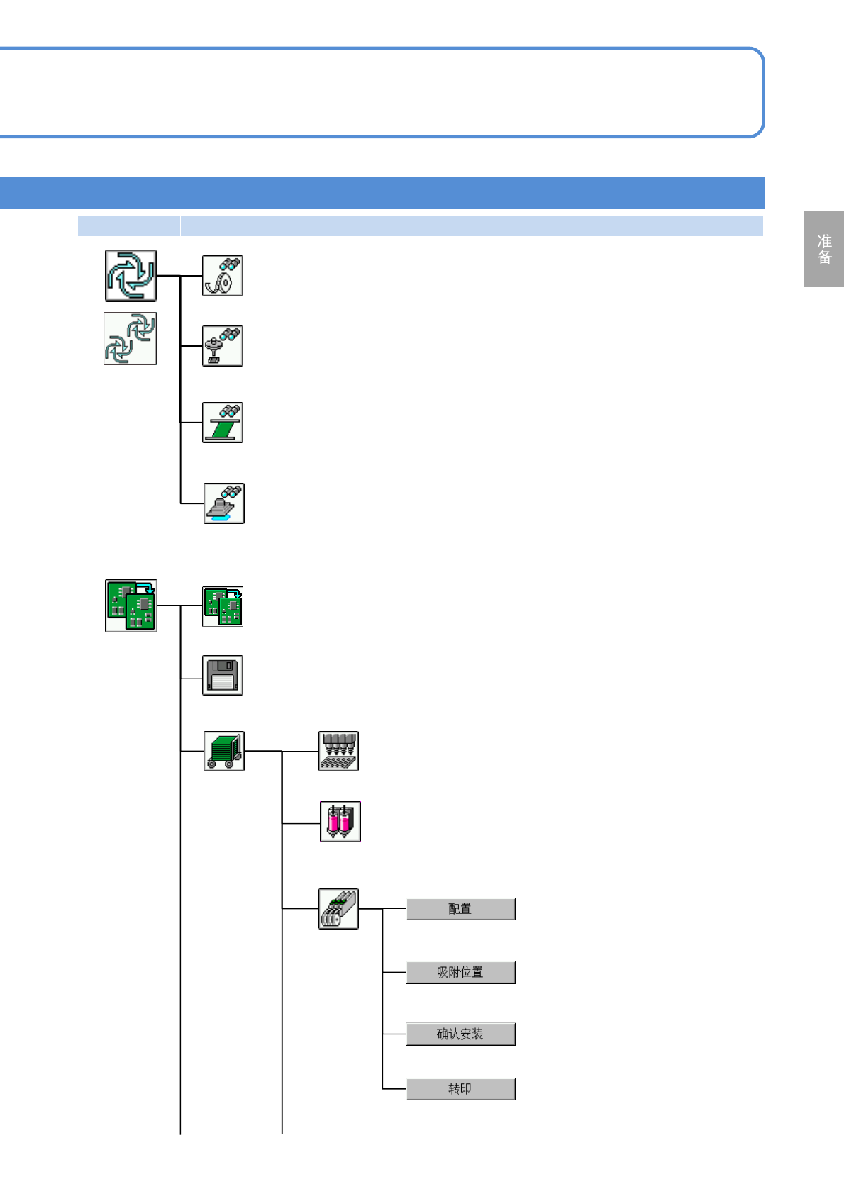 NPM-D3 EJM6DC-MB-02O-06 第 1 阶层 第 2 阶层 第 3 阶层 第 4 阶层 2-2-2 -6 段取り メニュー 余数监视器 确认生产线上的各工作台的元件用完 信息。 确认吸着状況。 吸着监视器 状況监视器 显示运转中的生产信息,零部件用完 信息,以及其他的各类信息。 生产菜单 ( 生产中 ) 连续准备 管理各工序生产前的个别准备作业。 读入机器数据、保存机器参数等文件 操作。 文件操作 显示各吸嘴位置的机器数…