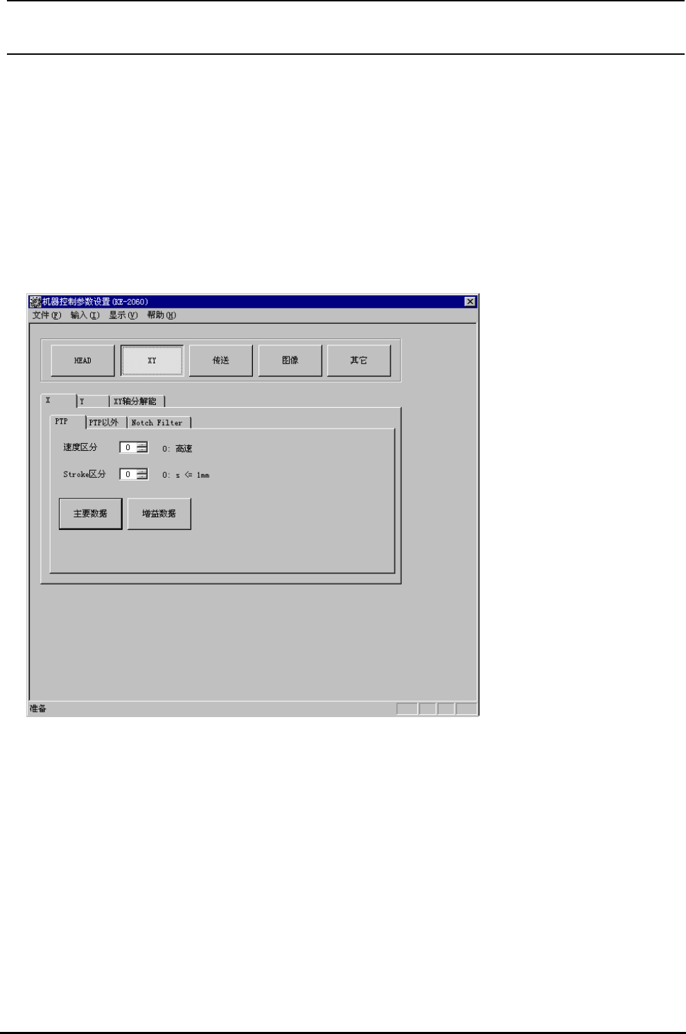R e v 1 . 0 0 机械控制参数 3-2-2 PTP 以外的动作的起动画面 选择了 [X 。 画面为 [X] 时的情形, [Y] 也一样。 ][PTP 以外] 或 [Y][PTP 以外] 之后,就会显示出如图 3-2-2 所示的表格 把 动作类别 设定到想编辑的目录中,选择了 [ 主要数据 ] 按键或 [ 增益数据 ] 按键之后, 设定的分类选择 画面就被显示出来。 目录在各画面也可以变更。 类别的详细内容请参阅 4-2…