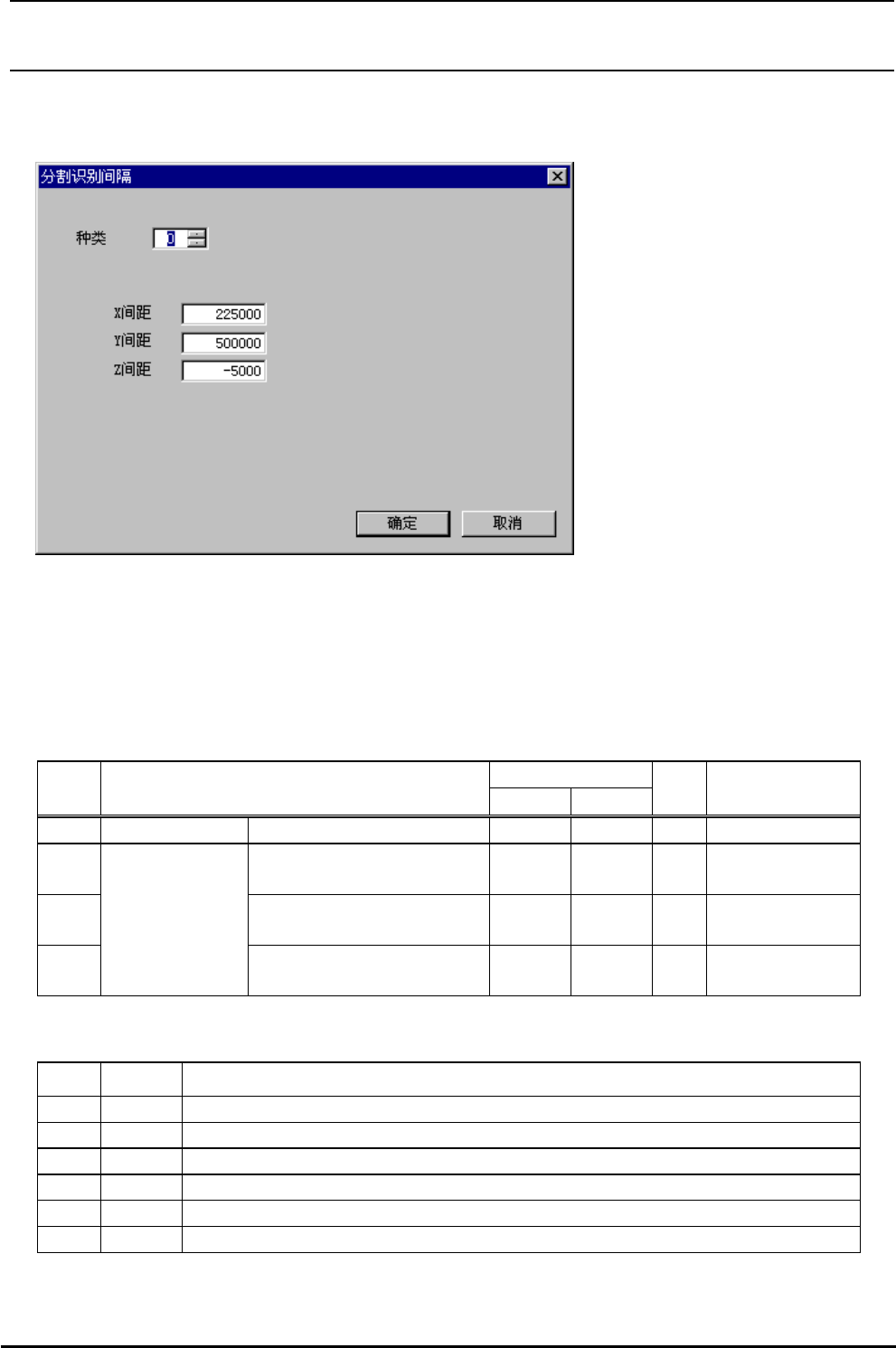 R e v 1 . 0 0 机械控制参数 4-4-5 分割识别间距 (BGA) 图 4-4-5 分割识别间距 (BGA) (1) 设定画面的显示方法 菜单∶ [ 输入 ]→[ 图像 ]→[ 分割识别 ]→[ 间距 (BGA)] 起动∶ [ 图像 ] 按键 →[ 分割识别 ] 标签 →[ 间距 (BGA)] 按键 (2) 设定项目 输入范围 № 项目 最小值 大值 备考 最 单 位 1 模式 0 3 6 参照 (3) 模式 2 X 间距 …