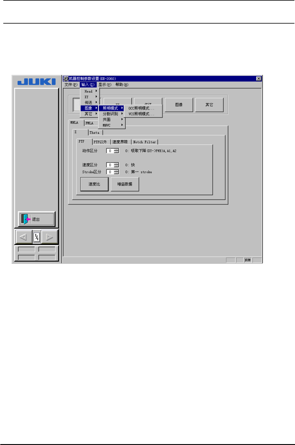 R e v 1 . 0 0 机械控制参数 2-2-4 图像 选择了 [画像] 之后,就会显示出如图 2-2-5∼ 图 2-2-7 所示的级联菜单。 图 2-2-5 图像菜单 ( 照明图案 ) (1) 照明图案 进行照明控制参数的设定。 ( a ) 进行 OCC 的照明图案的设定。 ( b ) 进行 VCS 的照明图案的设定。 注 ) KE-2050 时, VCS 照明图案菜单为非显示因此不能选择。 2-7
