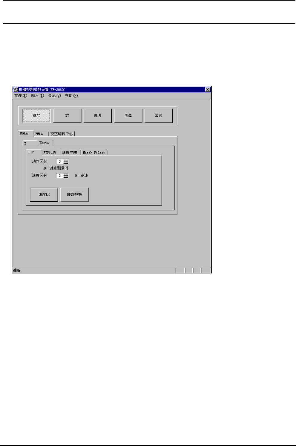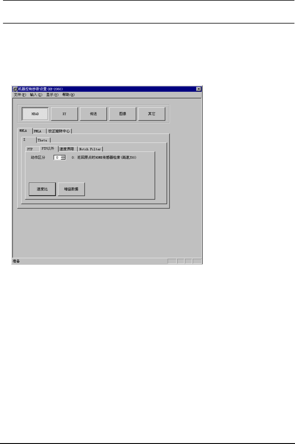 R e v 1 . 0 0 机械控制参数 3-1-2 Z 轴 PTP 以外的动作起动画面 选择了 [M 画面为 [M NLA][Z][PTP 以外] 或 [FMLA][Z][PTP 以外] 之后,就会显示出如图 3-1-2 所示的表格。 NLA] 时的情形, [FMLA] 也一样。 图 3-1-2 Z 轴 PTP 以外的动作起动画面 把 动作类别 设定到想编辑的目录中,选择了 [ 速度比 ] 按键或 [ 增益数据 ] 按键之后,…