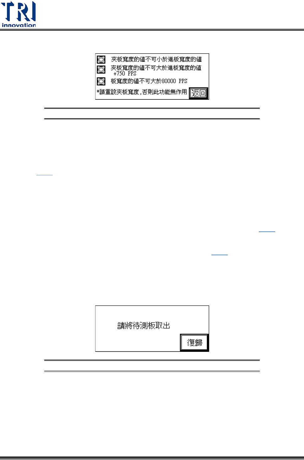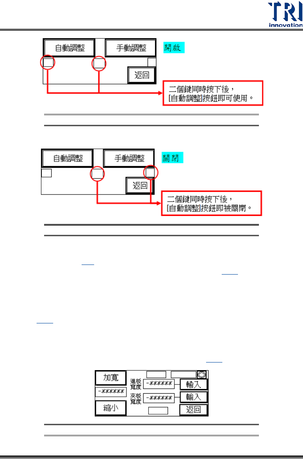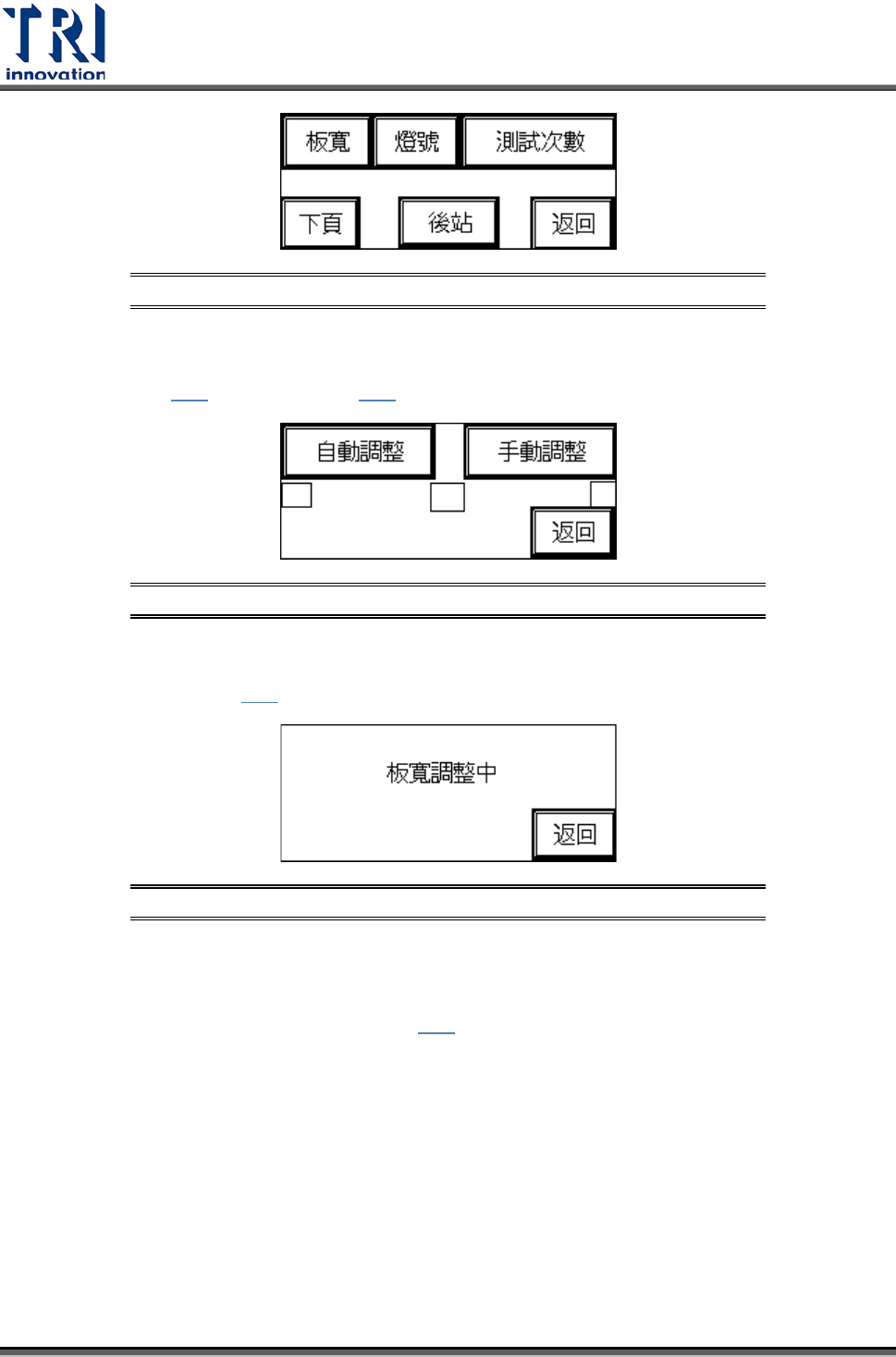 Test Research Inc. TR 7007 SII User Guide – Hardwa re 7 圖 10 : 其他設定 – 板寬 設定 – 隱藏鍵 – 開啟 圖 11 : 其他設定 – 板寬 設定 – 隱藏鍵 – 開啟 自動調整:按下 圖 9 中的 [ 自動調整 ] ,板寬會先作歸原點 ( 機械原點 ) 的動作,若為 出廠初次設定時,歸原點完成後,需先設定 ( 電氣原點 ) ,在 圖 12 中的原點會閃 爍,此時可按…