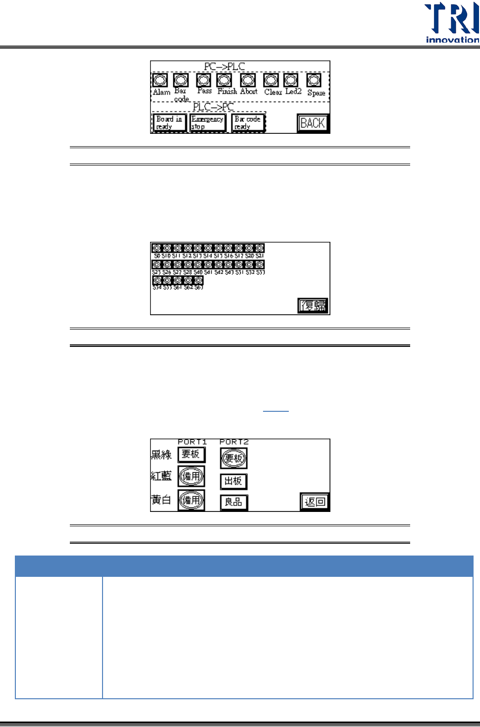 Test Research Inc. 22 TR 7007 SII User Guide – Hardwa re X93(IN) Sensor 4 X94(IN) Sensor 5 X95(IN) Sensor 6 X98(IN) 後站 READY (f rom loade — port2 黑綠 ) X 9 A( I N ) TES T OK (f r om p c) X9B(IN) PC 測試完成 (from pc) X9C(IN) …