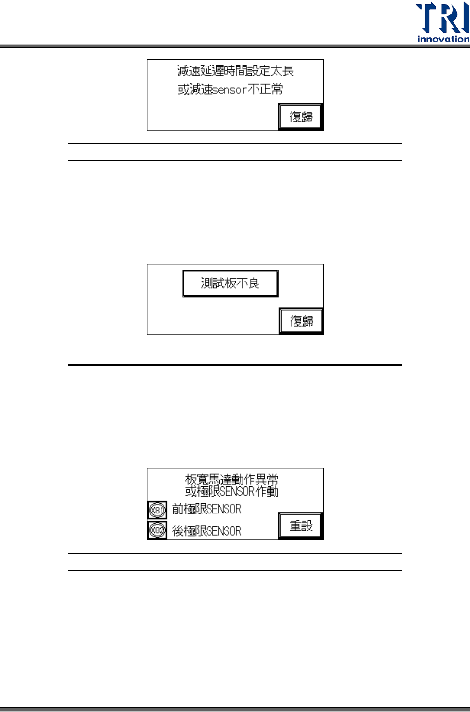 Test Research Inc. TR 7007 SII User Guide – Hardwa re 27 圖 67 : 人機介面 – 減速延遲時 間設定太 長或減速 sensor 不正常 3.3.7 測試板不良 當測試檢測不良時 PC 會送出 FAIL 的信號,此時需等 PC 確認後才會回到系統運轉中 的畫面。 圖 68 : 人機介面 – 測試板不良 3.3.8 板寬馬達動作異常或極限 S ENSOR 作動 7500L 或 7 …