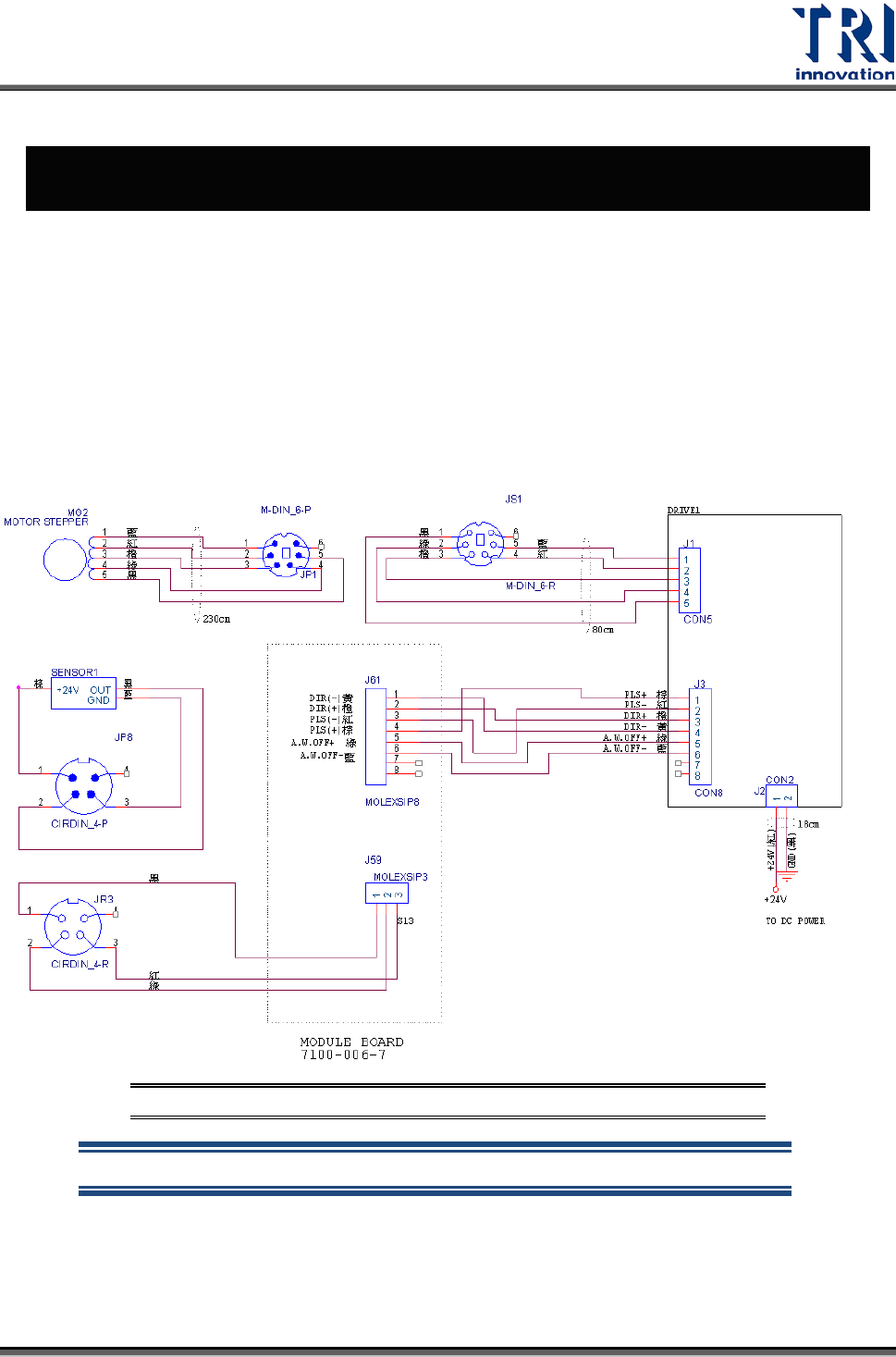 Test Research Inc. TR 7007 SII User Guide – Hardwa re 57 8 自動板寬調整 8.1 架構及功能 自動板寬調整功能可由直接操作人機介面按鈕來調整板寬,且程式製作時可把板寬調 整結果記錄在主程式當中,當下次開啟程式時,可自動調整板寬至之前程式製作時所 儲存的位置。 8.2 接線圖 圖 105 : 自動板寬調 整接線圖 馬達 Driver 指撥開關跳至 1,2 處