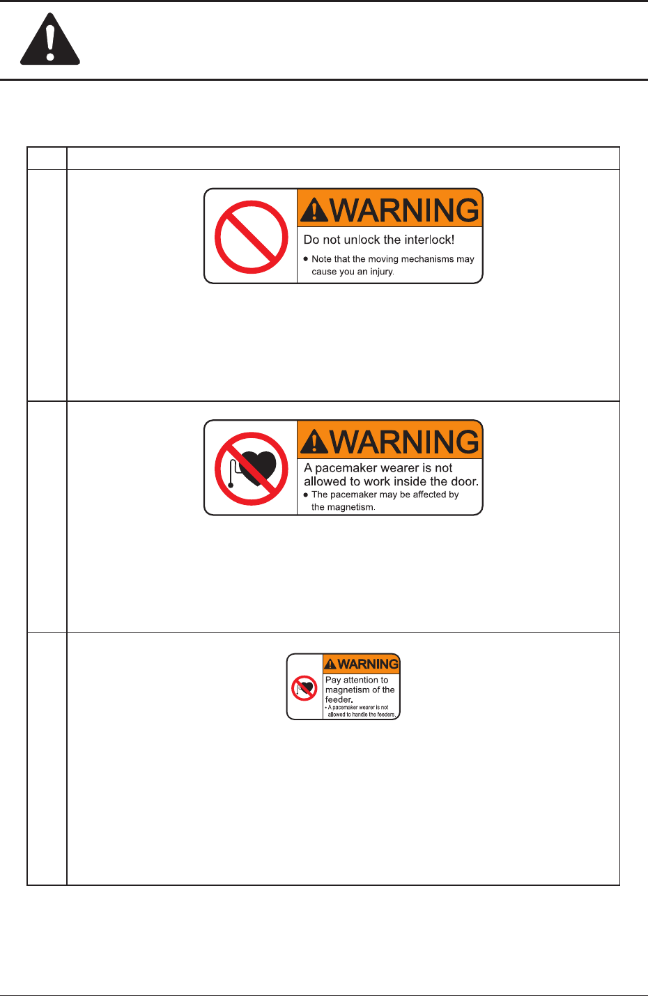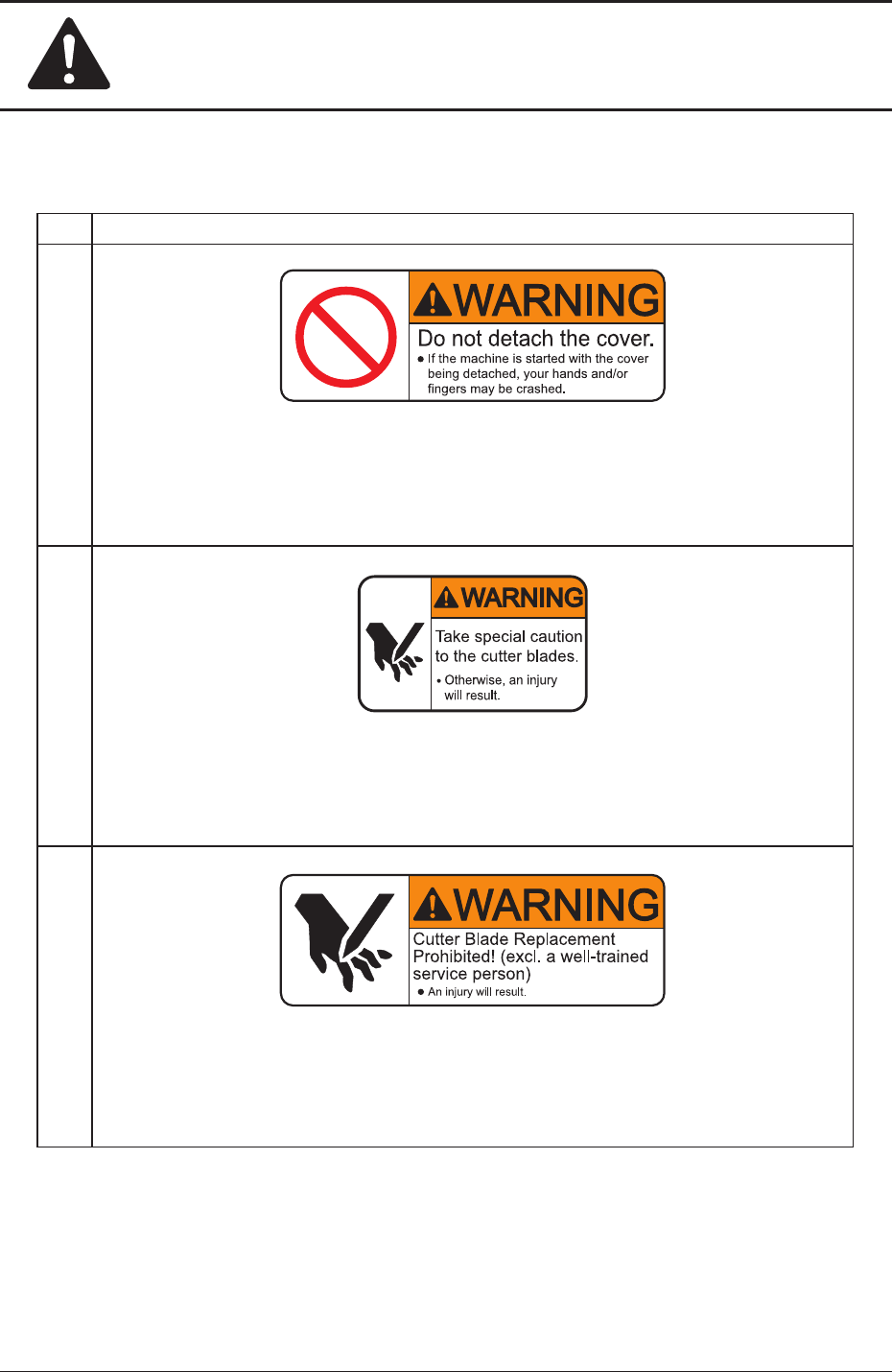 Safety Precautions Safe-25 AKHE-ID No. Alert Labels and Description (4) Description The machine must be used with the covers being attached. Otherwise, you may be trapped by the moving mechanism and a serious accident …