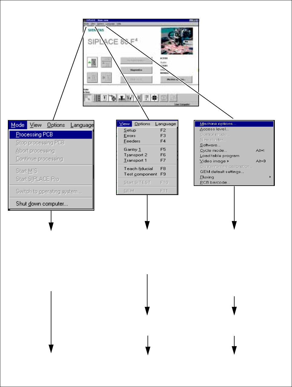 SIPLACE 80S-20/F4/F5 User M anual 2 Introduction and Basic Concepts 05/99 Issue from Software Version SR.405.xx 2.3 Overview of the User Interface and Menu Functions 2 - 21 2.3 Overview of the User Interface and Menu Fun…