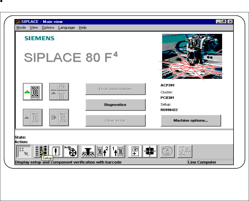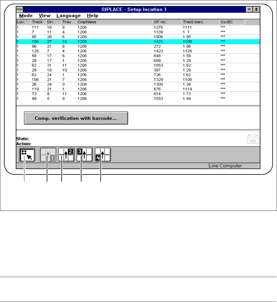 3 Placement Functions SIPLACE 80S-20/F4 /F5 User Manual 3.2 Set-Up 05/99 Issue f rom Software Version SR.405.xx 3 - 6 Fig. 3.2.2 Set-up 1-4 menu window - Key to Fig. 3.2.2 1 T o the Main vie w 2 Displ ay set-up fo r loca…