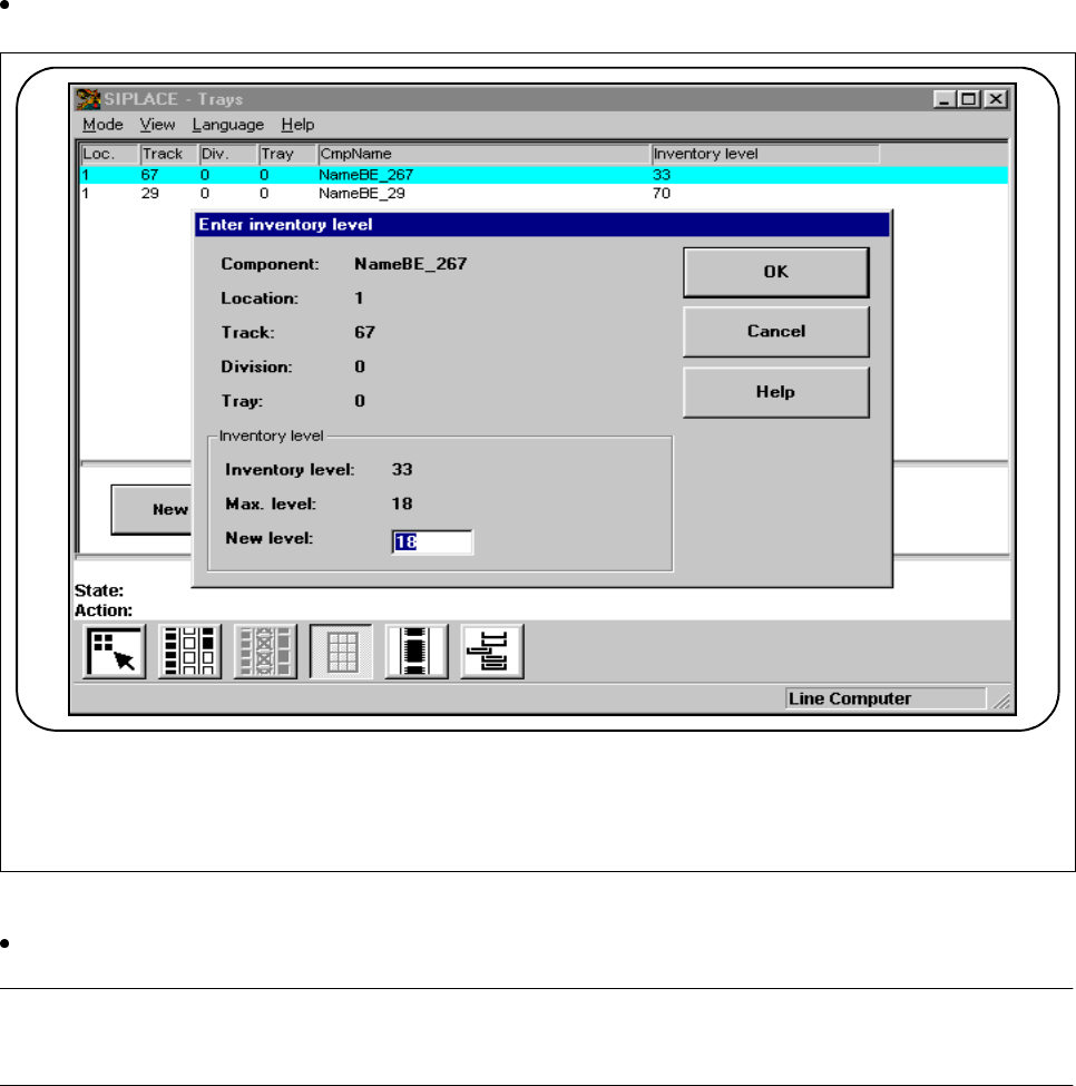 3 Placement Functions SIPLACE 80S-20/F4 /F5 User Manual 3.4 Feeders 05/99 Issue from Software Version SR.405.xx 3 - 28 Click on the New inve ntory level button i f you want to enter a new i nventory l evel for this track…