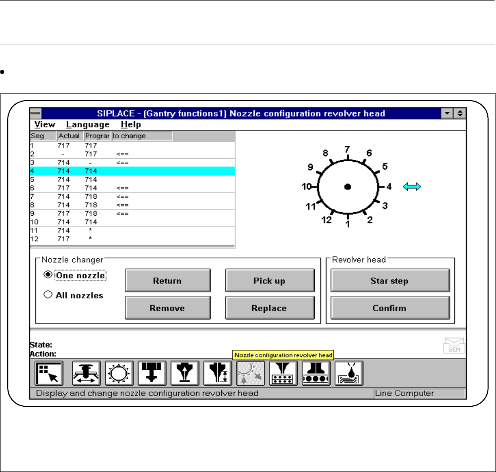 SIPLACE 80S-20/F4/F5 User M anual 4 Single Functions 05/99 Issue from Software Version SR.405.xx 4.2 Single Functions, Gantry with 12x Revolver Head 4 - 17 4.2.6 .1 12x Revolv er Head - St ar Step When th is functi on is…