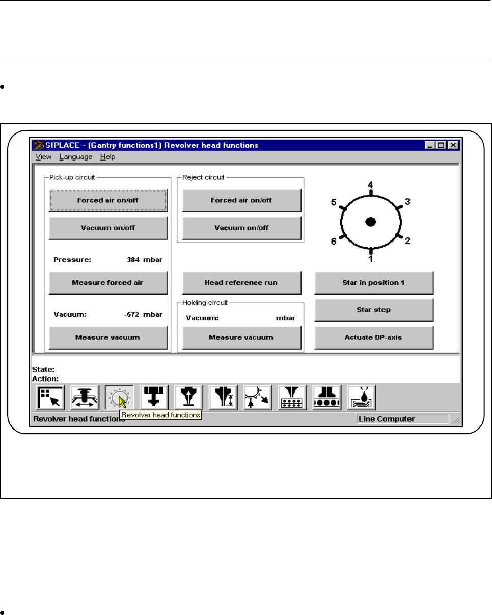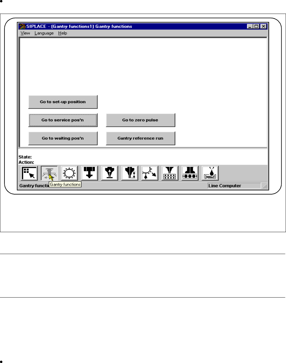 SIPLACE 80S-20/F4/F5 User M anual 4 Single Functions 05/99 Issue from Software Version SR.405.xx 4.3 Single Functions, Gantry with 6x Revolver Head (f or 80F5) 4 - 27 4.3.1.2 Go to Ser vice Posit ion At the s ervice po s…