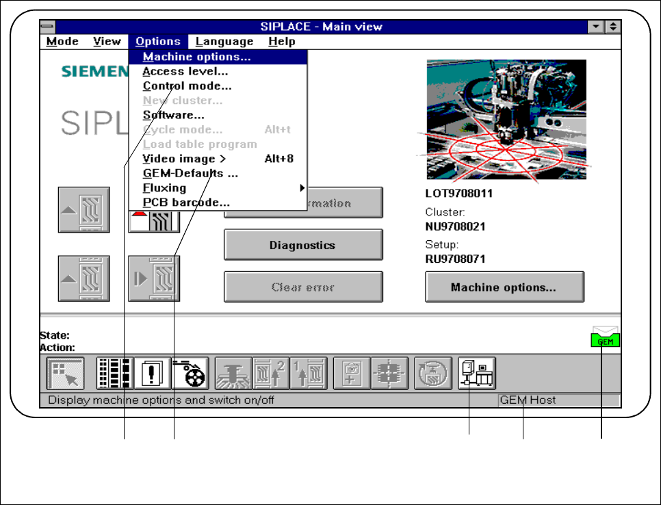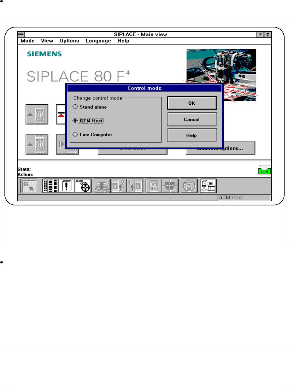 11 Station Extensions/Options SIPLACE 80S-20/F4/F5 User Manual 11.9 GEM Interface 05/99 Is sue from Software Version SR.405.xx 11 - 60 1 1.9.2 Operation 1 1 .9.2.1 Main Menu with GEM Interface Option Fig. 1 1.9.2 Main vi…