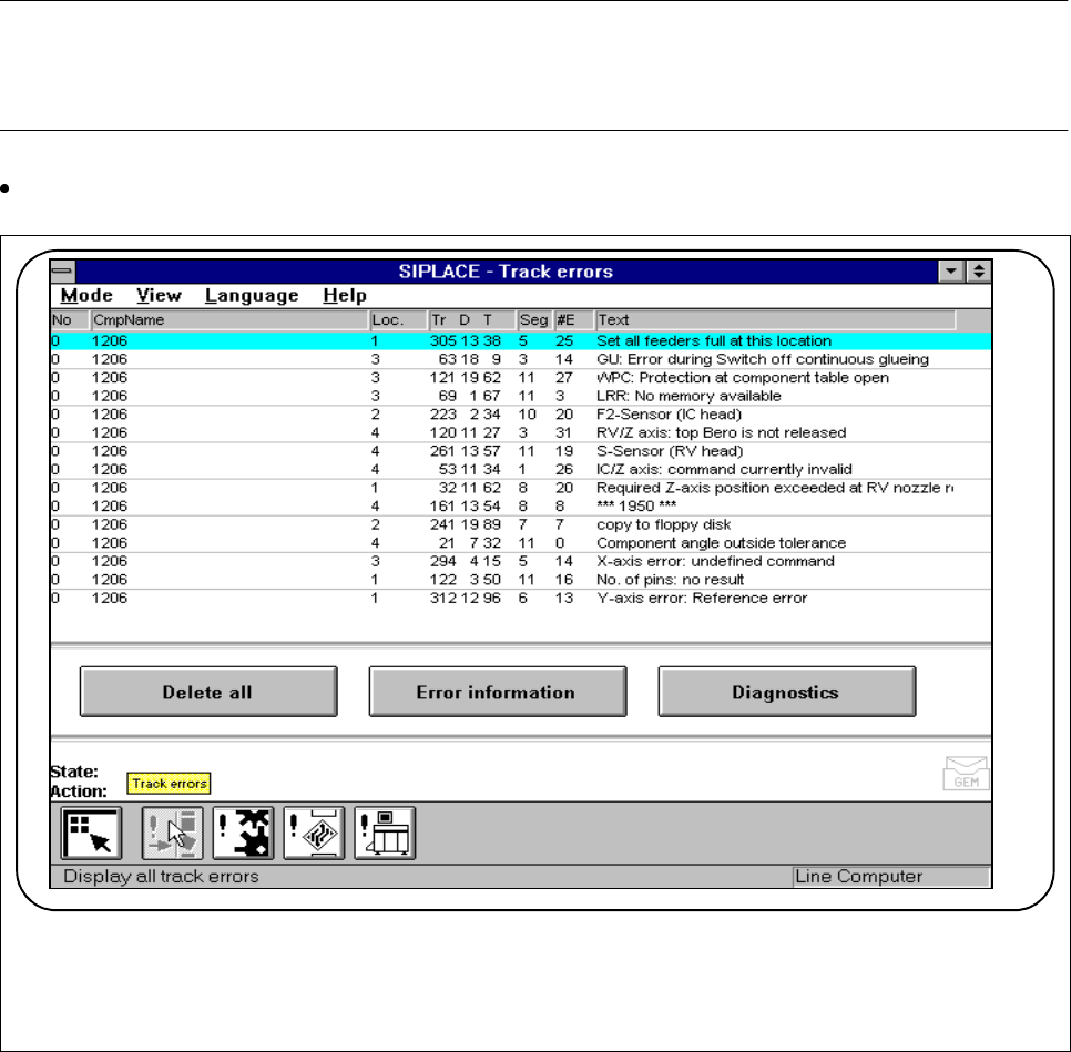 SIPLACE 80S-20/F4/F5 User M anual 3 Placement Functions 05/99 Issue from Software Version SR.405.xx 3.3 Error 3 - 13 3.3 Error The "Err or“ menu is used to display lists of various error ty pes. Error informati on a…