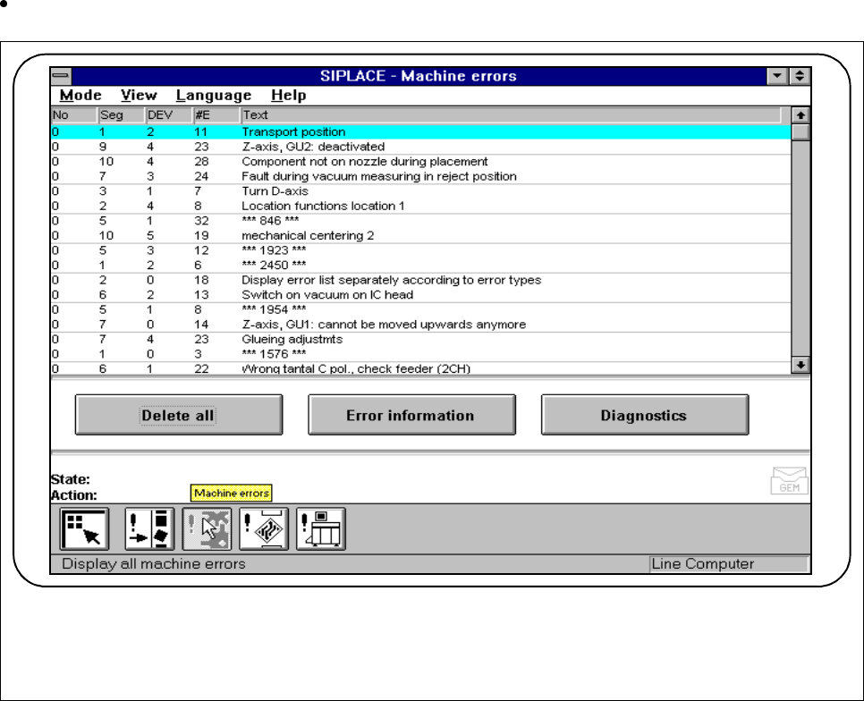 SIPLACE 80S-20/F4/F5 User M anual 3 Placement Functions 05/99 Issue from Software Version SR.405.xx 3.3 Error 3 - 17 3.3.2.1 Error Information Mark a single li ne (high lighted a gainst a b lue bar) a nd clic k on the Er…