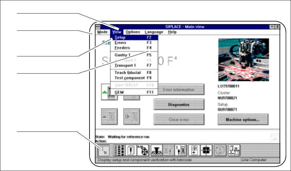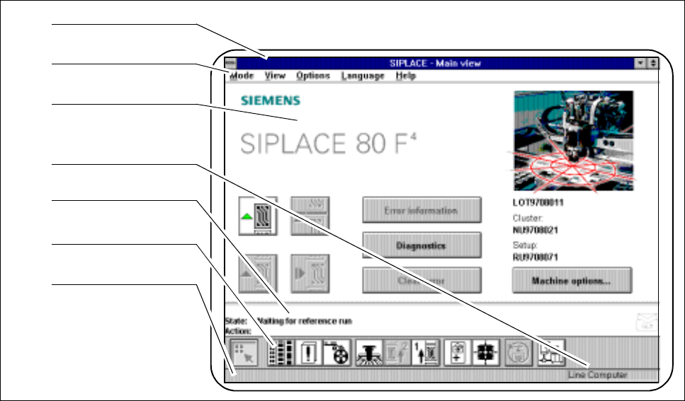 2 Introduction and Ba sic Concepts SIPLACE 80S-20/F4/F5 User Manual 2.2 Principles and Structure of the User Interface 05/99 Issue from Software Version SR.405.xx 2 - 12 2.2.2.1 Ti tle bar The title bar shows the mach in…