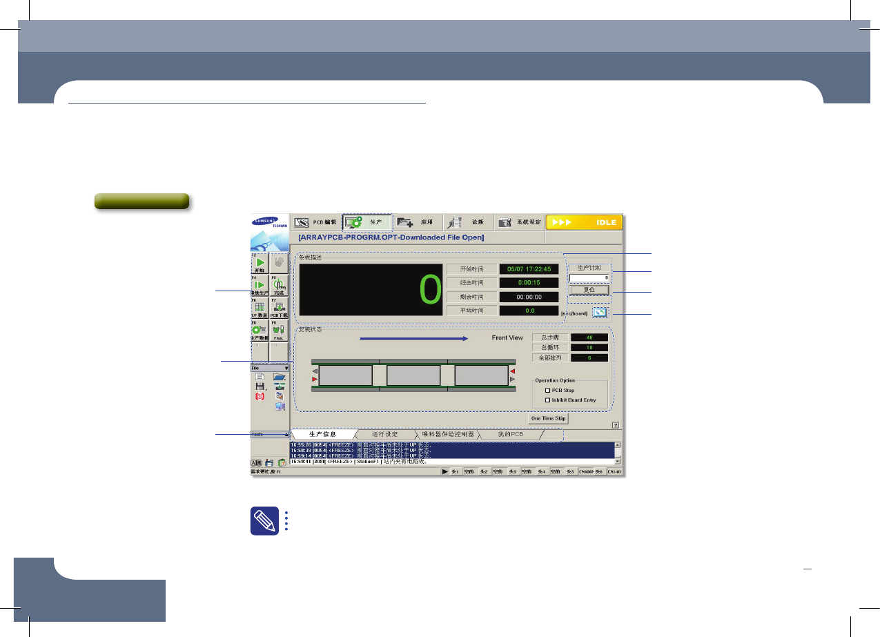 Chapte r 1 设 备概 要 Operation Handboo k 11 Chap ter 1 Fast & Flexible Chip Shooter 设备概要 本部 分介 绍设 备、操 作面 板及 MMI (M an -M ac hin e I nt er fac e) 。 输入 生产 量 PC B 实 际生 厂数值 初始 化( 0) 表示作业进行情况 生产关联 T ab Dialog Box 表示 PC B 基板 …