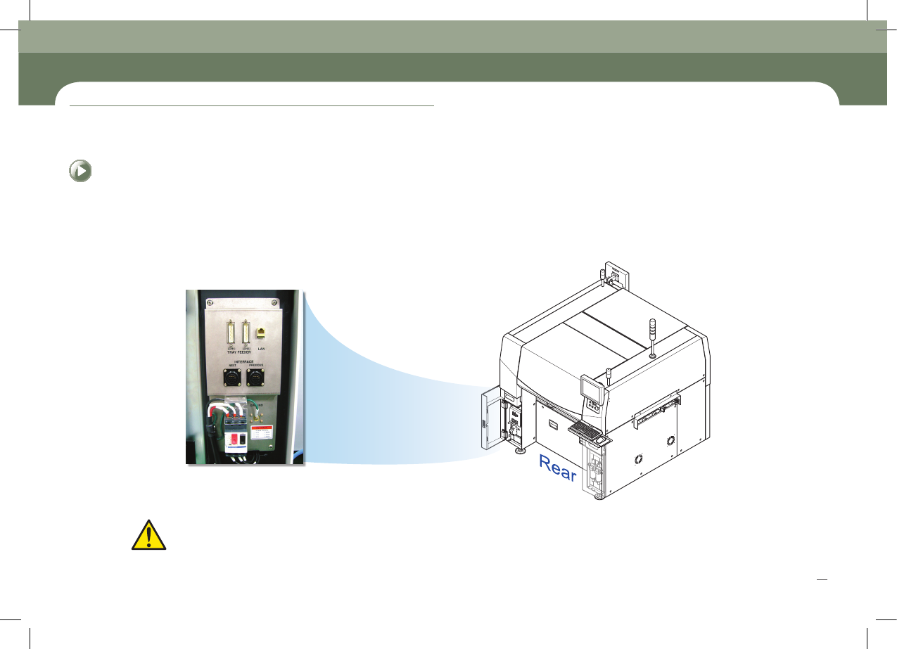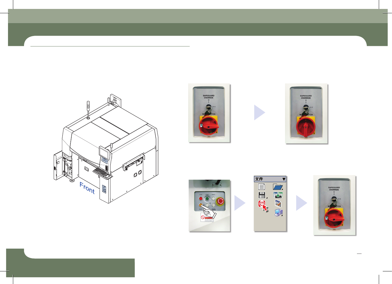 Chapte r 2 电源 供给 及生 产前 准备 程序 Operation Handbook 1 7 Chap ter 2 Fast & Flexible Chip Shooter 电 源 供 给 及 生 产 前 准 备 程 序 本部 分主 要介 绍电源 供应 方法 及生产 开始 前的 检验 事项 。 - 电源 Of f 状态 - 电源 On 状态 AIR PRESSURE SAFEGUARD OVERRIDE MAIN SW…