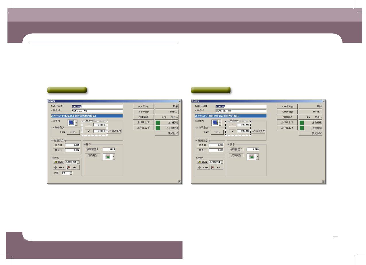 Operation Handbook 30 Chap ter 3 Fast & Flexible Chip Shooter 生 产 本章 节主 要介 绍生产 作业 顺序 1 . 传 送 轨 道 宽 度 调 节 2. 选 择 ‘ 基板 ’ 子 菜 单 Mo de l: 41 1 Mo de l: 4 21 , 41 1F