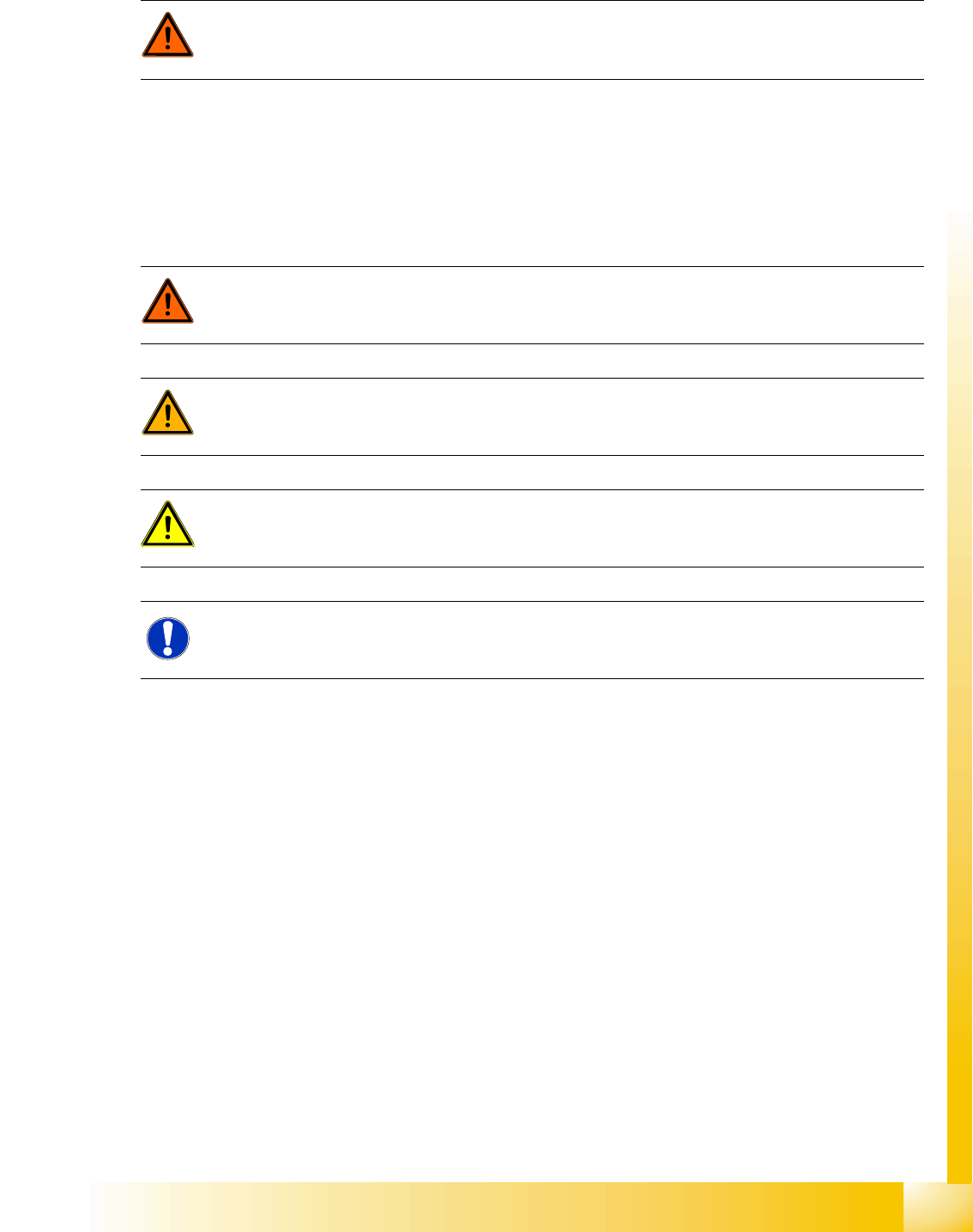 damage to equipment. These notes are highlighted by warning triangles and are indicated as follows