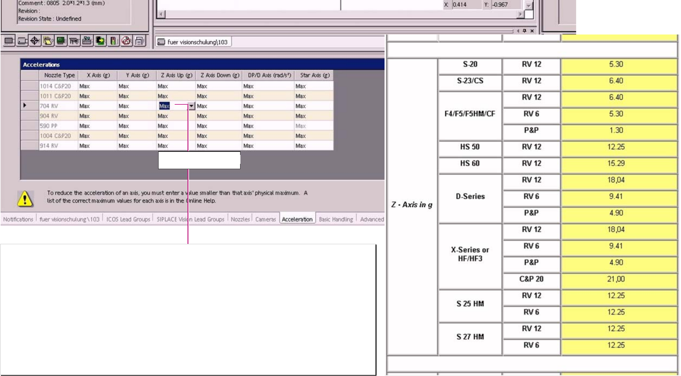 In this list an axis specific reduced acceleration could be programmed for the placement sequence with a desired nozzle type This influence the force to the contact area