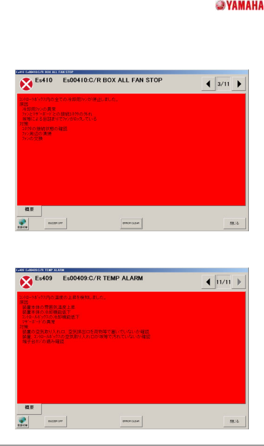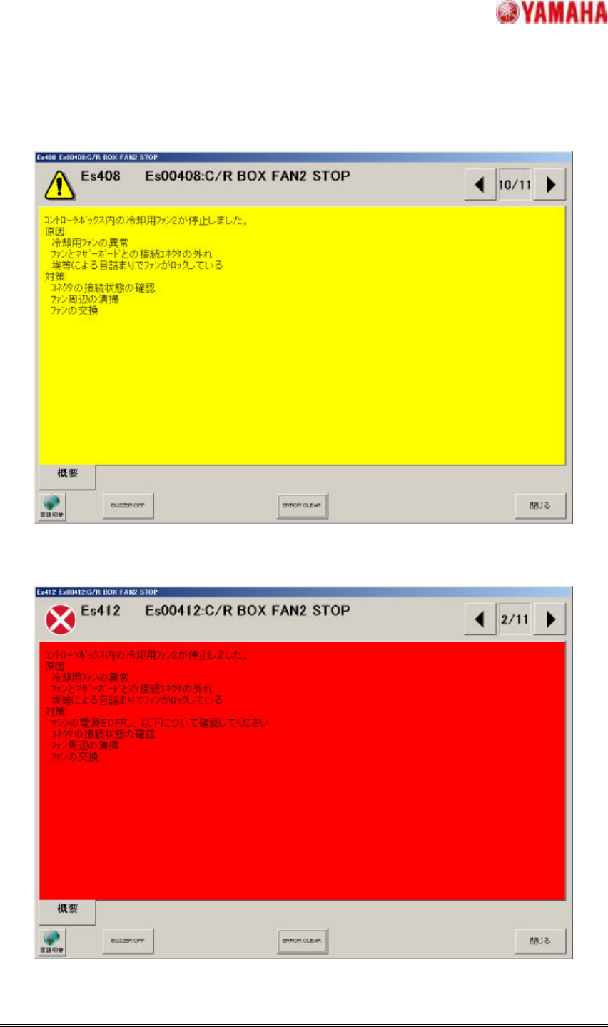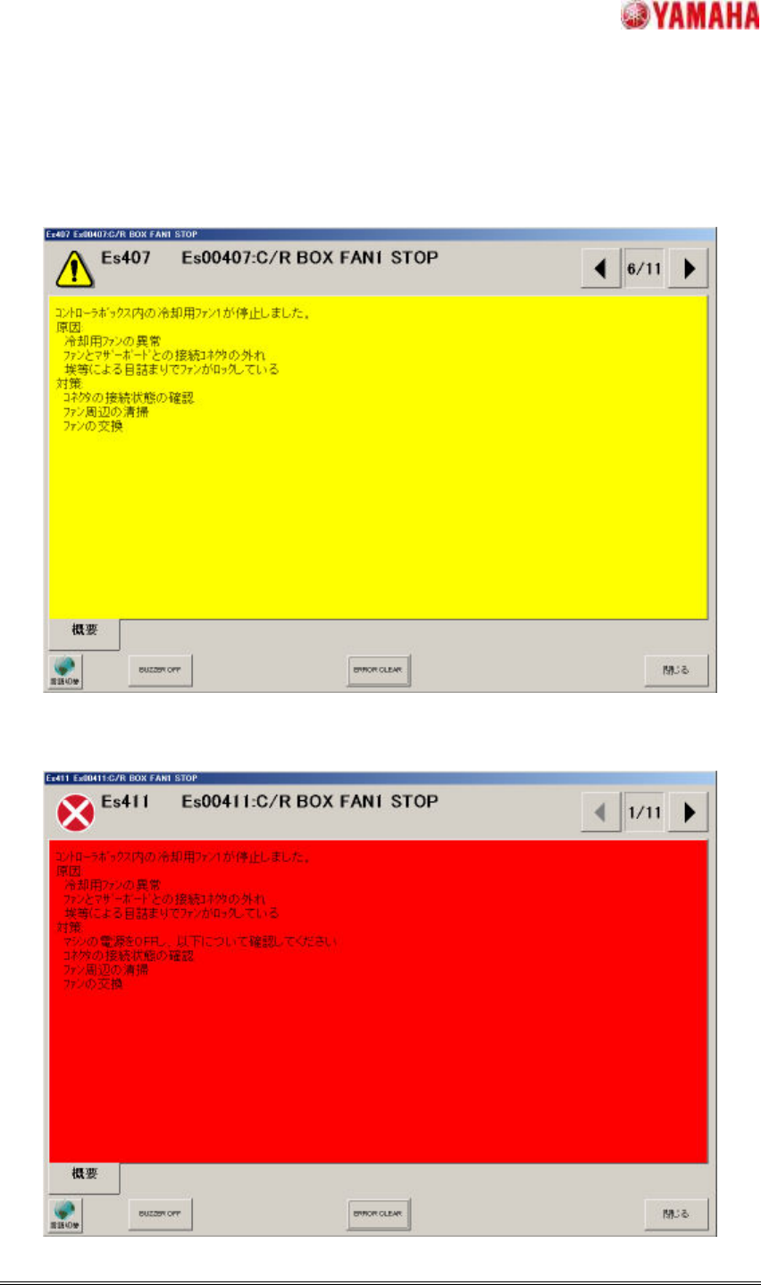 ヤマハ発動機株式会社IM 事業部 マウンター技術部ソフト開発グループ MD OC-SOFT50056 11/15 4.1.5C/R 4.1.5C/R 4.1.5C/R 4.1.5C/R ボ ックスファン ボックスファン ボックスファン ボックスファン 2 2 2 2 停止 停止 停止 停止 C/R ボックスの冷却 用ファン 2 が何らかの 原因で停止した 場合に、 下記のエ…