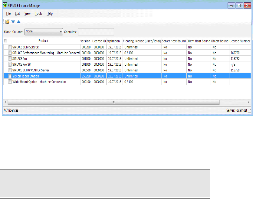 7 Software Vision Teach Station User Manual 7.4 Licensing 05/2015 Edition 152 7.4 Licensing As of the 5.0.2 version, the SIPLACE Vision T each Station is available as a pure licensed software product. 7 A "Vision T …