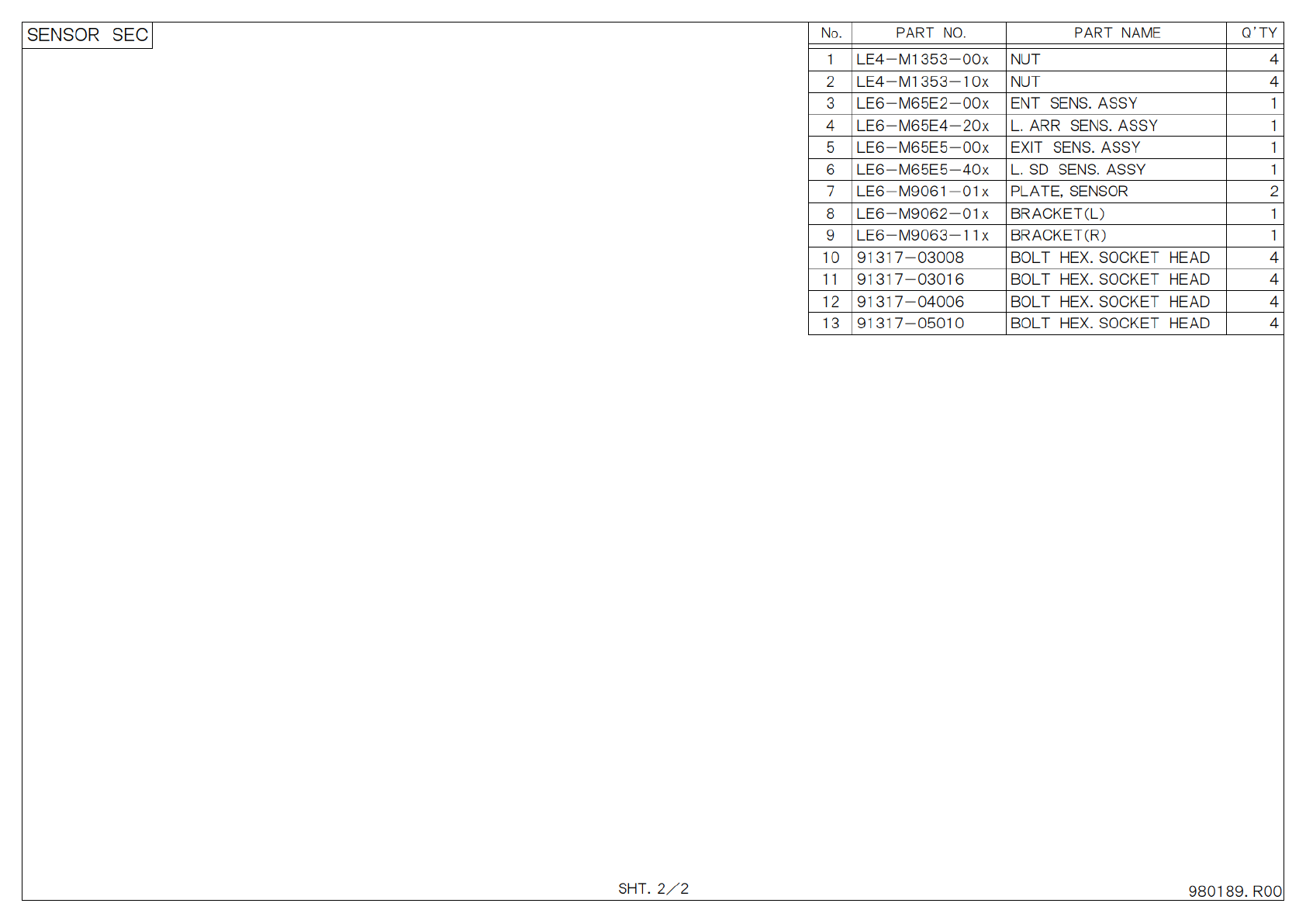 S H T . 2 / 2 P A R T N O . P A R T N A M E Q ’ T Y N o . 1 L E 4 - M 1 3 5 3 - 0 0 x N U T 4 2 L E 4 - M 1 3 5 3 - 1 0 x N U T 4 3 L E 6 - M 6 5 E 2 - 0 0 x E N T S E N S . A S S Y 1 4 L E 6 - M 6 5 E 4 - 2 0 x L . A R …