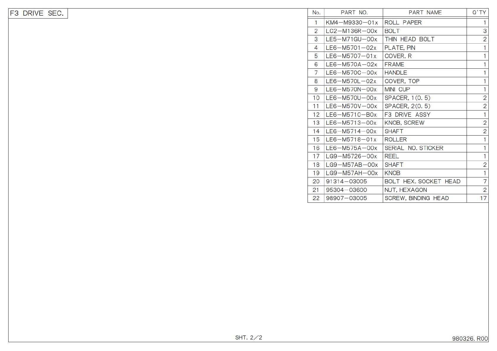 S H T . 2 / 2 P A R T N O . P A R T N A M E Q ’ T Y N o . F 3 D R I V E S E C . 9 8 0 3 2 6 . R 0 0 1 K M 4 - M 9 3 3 0 - 0 1 x R O L L P A P E R 1 2 L C 2 - M 1 3 6 R - 0 0 x B O L T 3 3 L E 5 - M 7 1 G U - 0 0 x T H I …