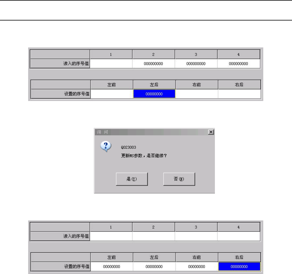 Rev1.00 MS 参数 2-3 ③ 确认机器中组装的激光单元的序 号,再点击与之对应的 Head 单元的长方格,即变成下图所示 。 ④ 全部建立关系后,点击 “ 设备设置 ” 按 钮,会显示如下所示的对话框。 ⑤ 在此选择 “ 是 ” ,建立关系即告完成。 另外,如选择 “ 重新设置 ” ,则 “ 设置的序号值 ” 内设置的序号被重设。