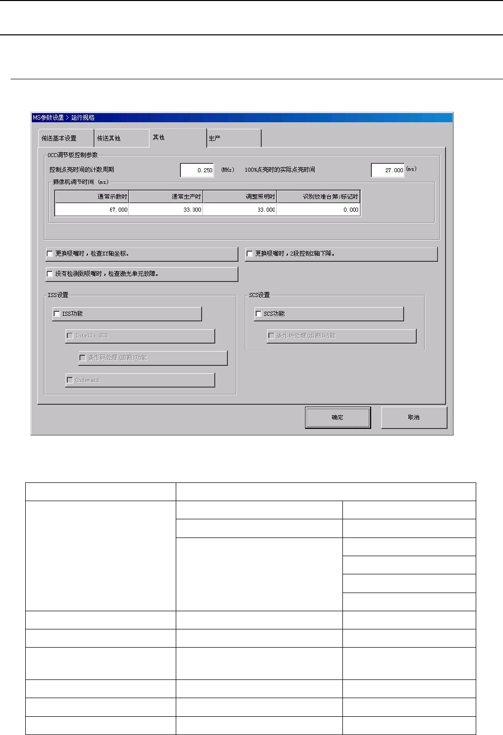 Rev1.00 MS 参数 2-13 2-7-1-3 其他 点击选项卡 “ 其他 ” ,会显示以下的对 话框。 “ 其他 ” 的对话框中可进行以下的 设置。 项目 选择的内容 控制点亮时间的计数周期 100% 点亮时的实际点亮时间 示教时 生产时 调整照明时 OCC 调节板控制参数 摄像机调节时间 识别共通标记时 更换吸嘴时,检查 XY 轴的坐标 更换吸嘴时, 2 段控制 Z 轴下降 没有检测到吸嘴时,检查激光 单元故障 ISS 设置 …