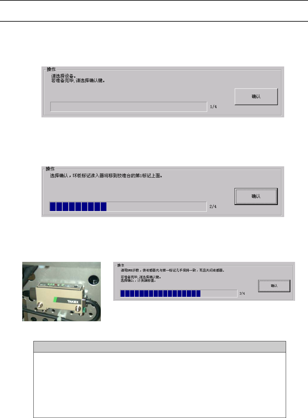 ⑥ 选择“确认”后,通过坏板标记传感器测量校准台的第1标记的位置。
