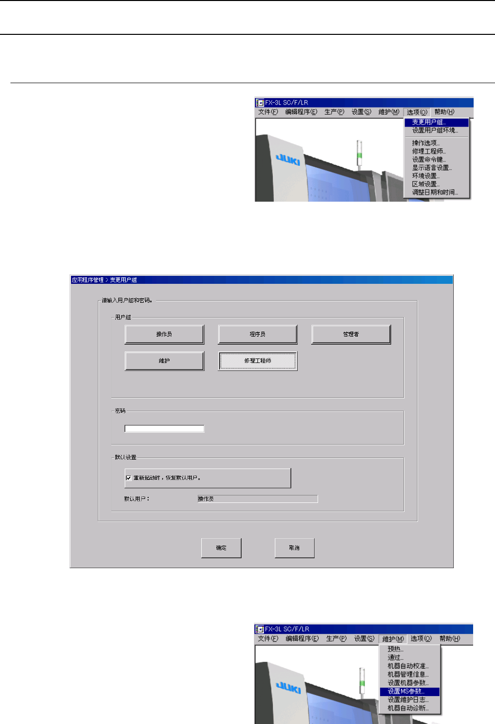 Rev1.00 MS 参数 1-2 1-3 启动、结束和数据的更新 ① 选择 “ 选项 ”→“ 变更用户组 ” 。 图 1 - 3 - 1 选项的下拉菜单 ② 出现变更用 户级别的对话框,选择 “ 修理工程师 ” ,输入已设置的密码。 图 1-3-2 用户级别的变更画面 ③ 选择 “ 维护 ”→“ 设置 MS 参数 ” 。 图 1-3-3 维护的下拉菜单