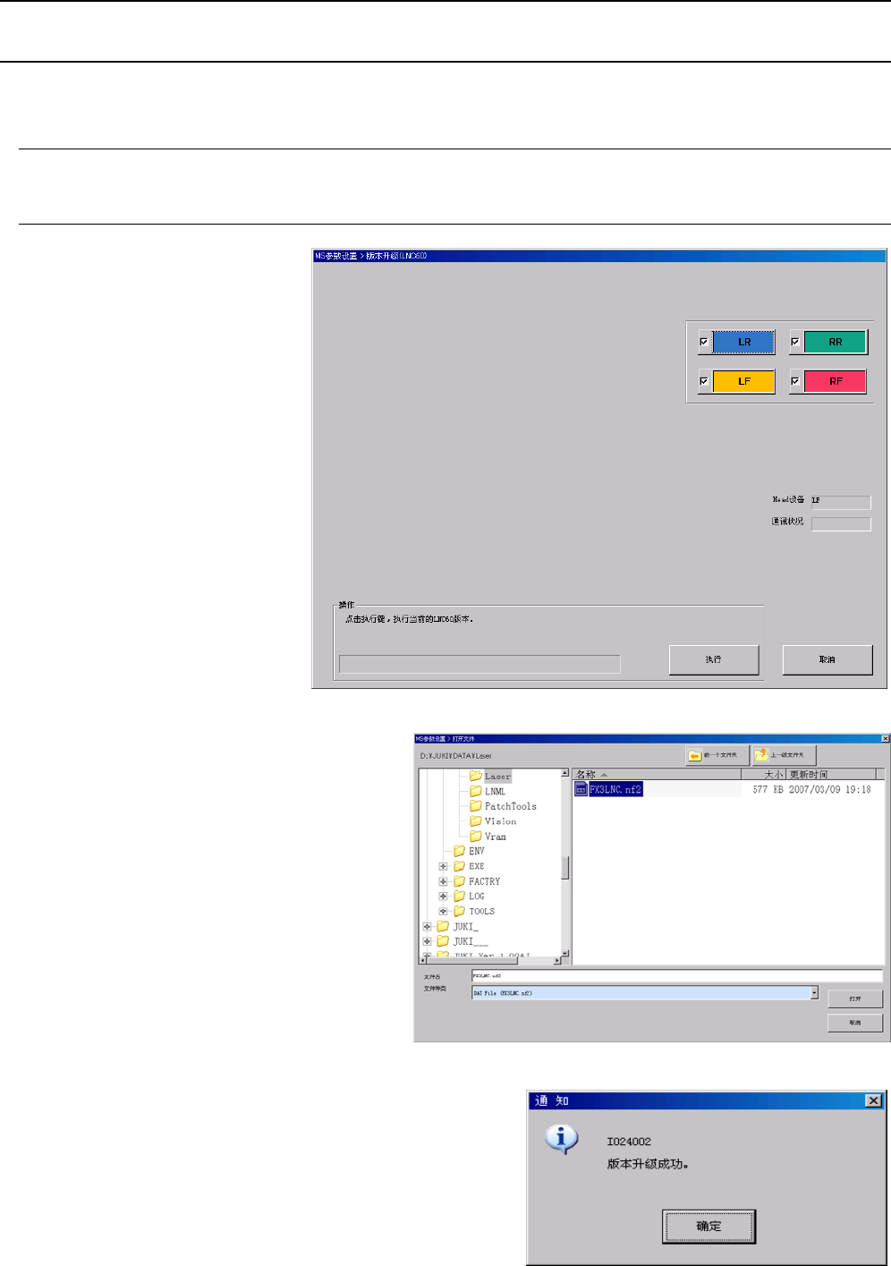 Rev1.00 MS 参数 4-3 4-3 版本升级 -BaseCarry 4-3-1 操作 ① 选择 “ 版 本升级 ” - “ 版 本升级 -BaseCarry” 后, 会 显示以下的对话 框。 ② 按 “ 执行 ” 按钮, 打开用于进行版本 升级的对话框。 (默认位置: D : \JUKI\DATA\BaseCarry )选择 文件( BaseCarry.bin ),按 “ 打开 ” 按钮,读入文件,向 BaseCarry 转 送…