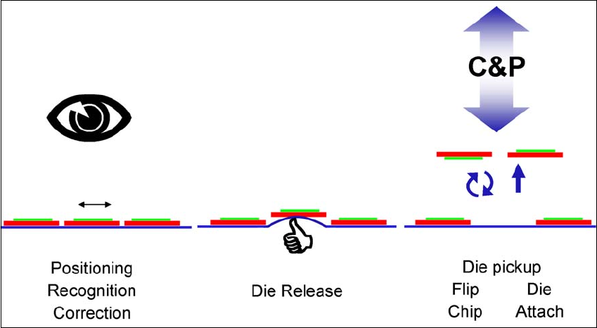 (此系统将晶粒从晶圆料膜中释放出来),然后把它转送到倒装单元。