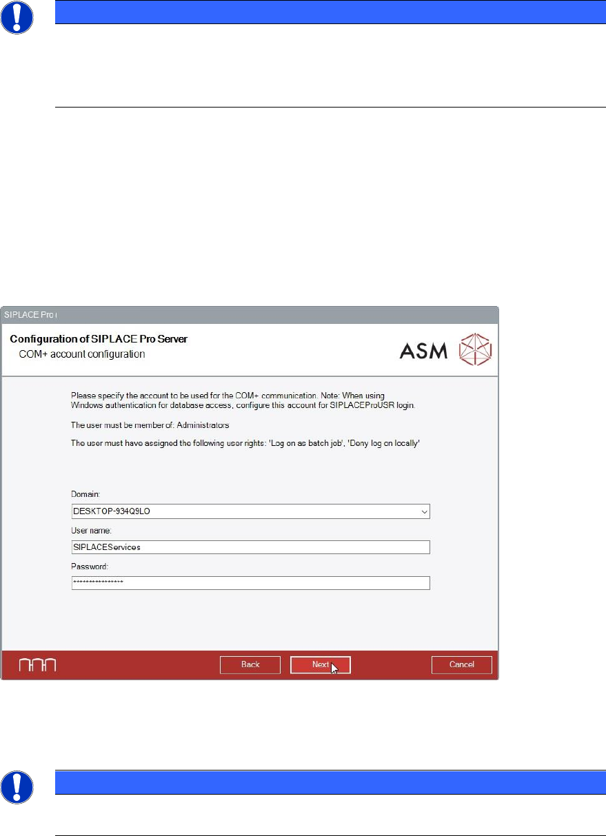In this dialog you specify under which Windows user account the server component of SIPLACE