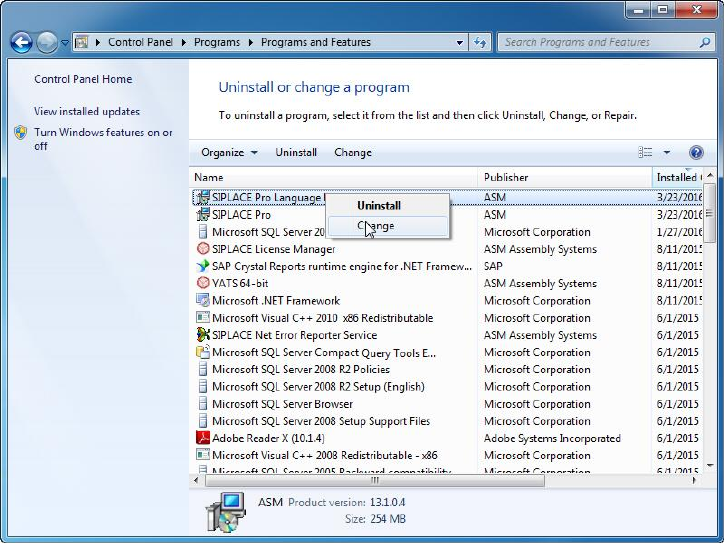 ► Click with the right mouse key on the SIPLACE Pro Language Pack entry in the list of installed