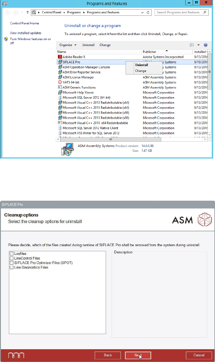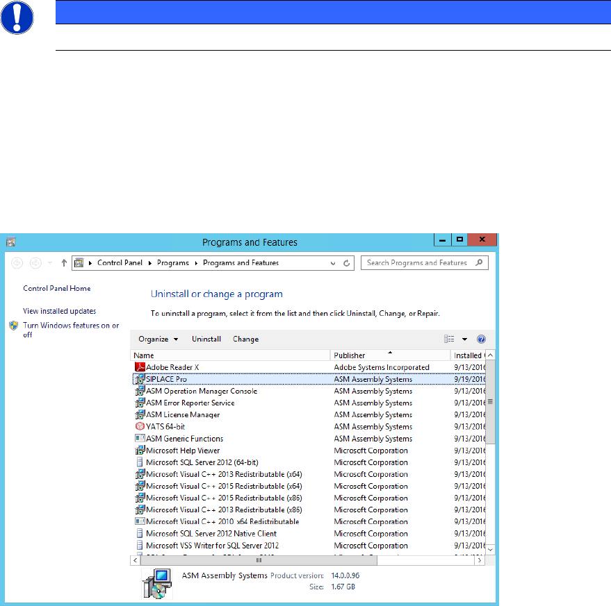 SIPLACE Pro 17.0 (R19-2) / Installation Manual 11/2019 Edition 62 9 Uninstalling the SIPLACE Pro Software Uninstalling SIPLACE Pro delete s all SIPLACE Pro software components from the s ystem except for the SIPLACE Pro …